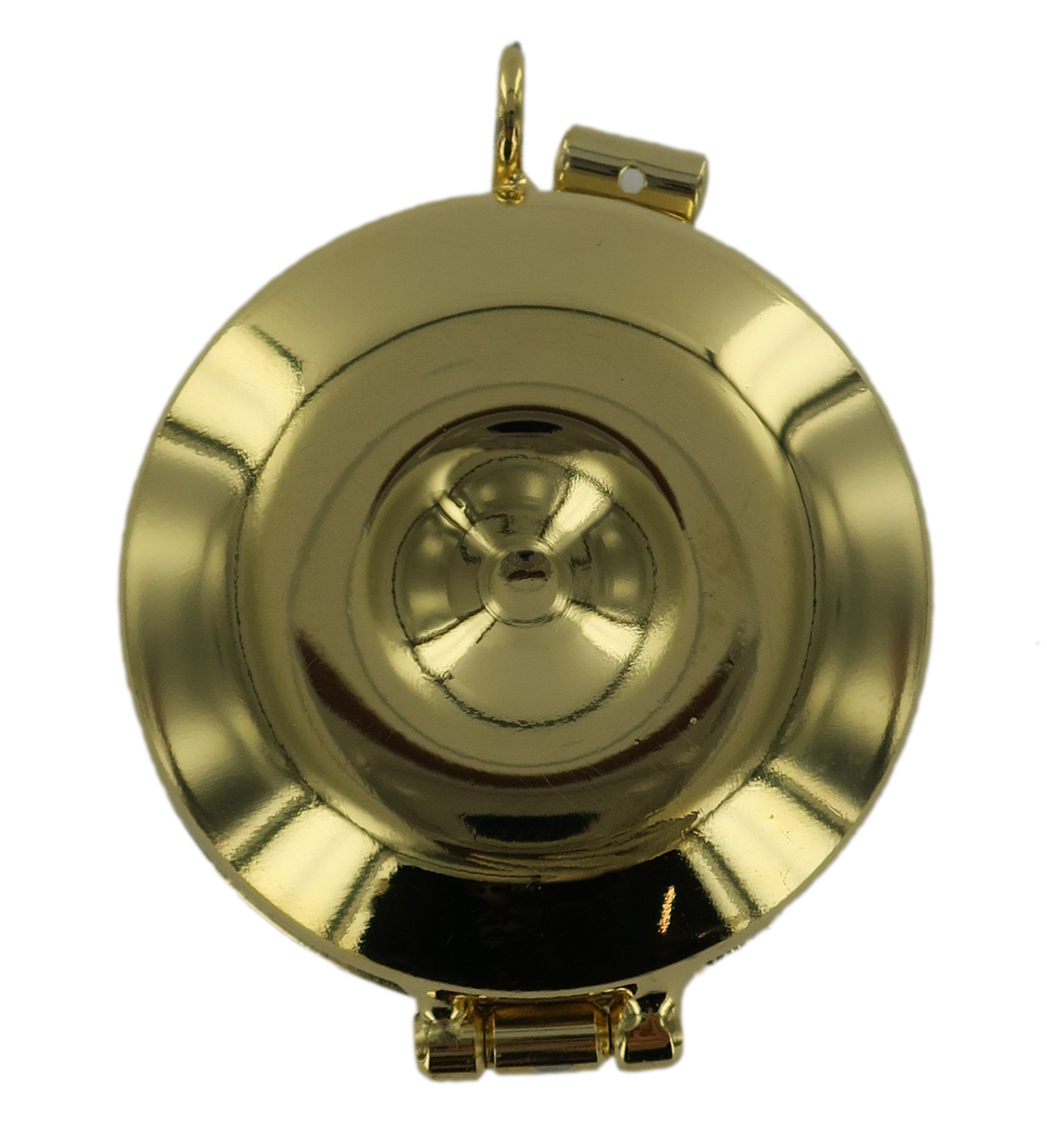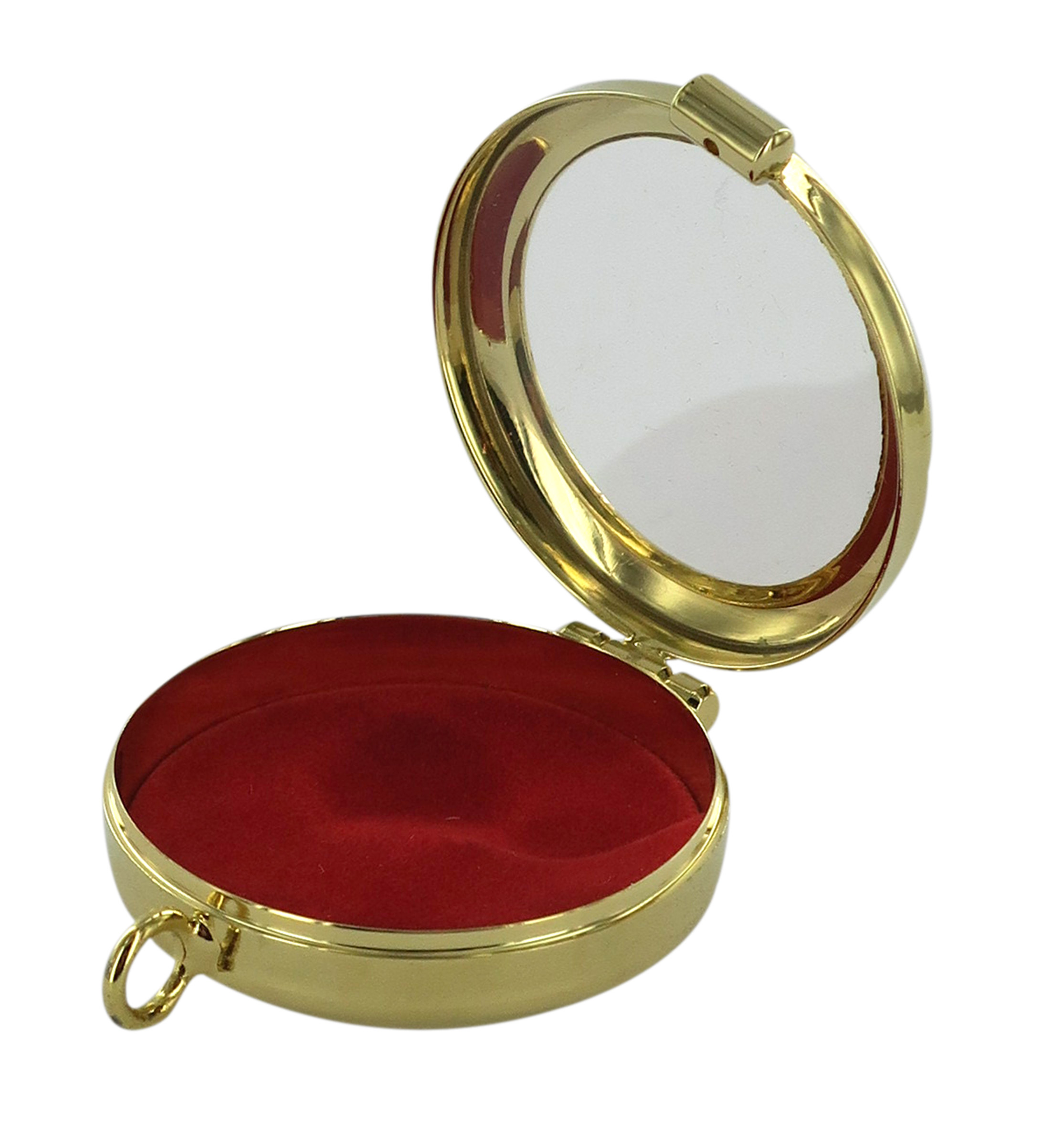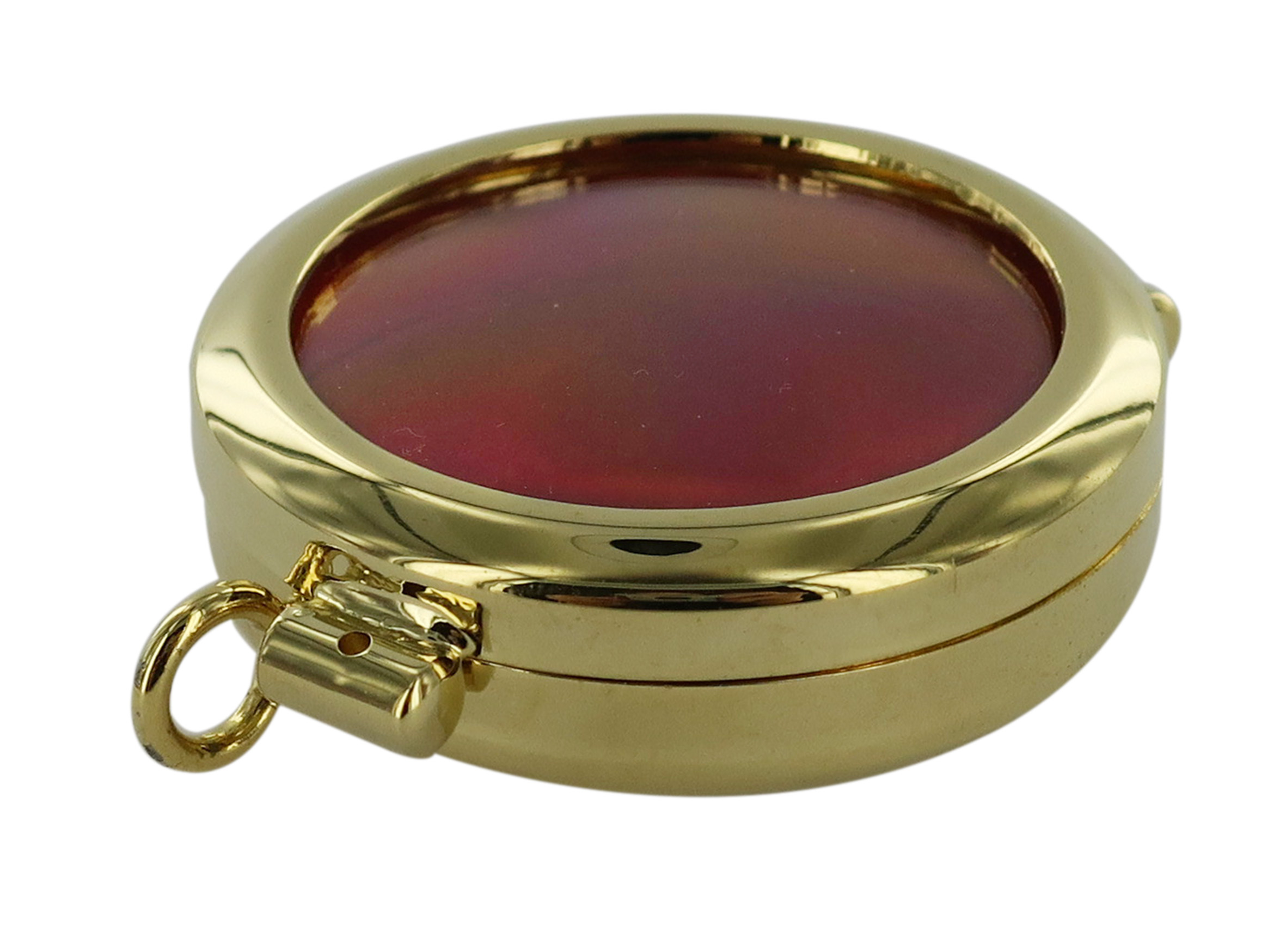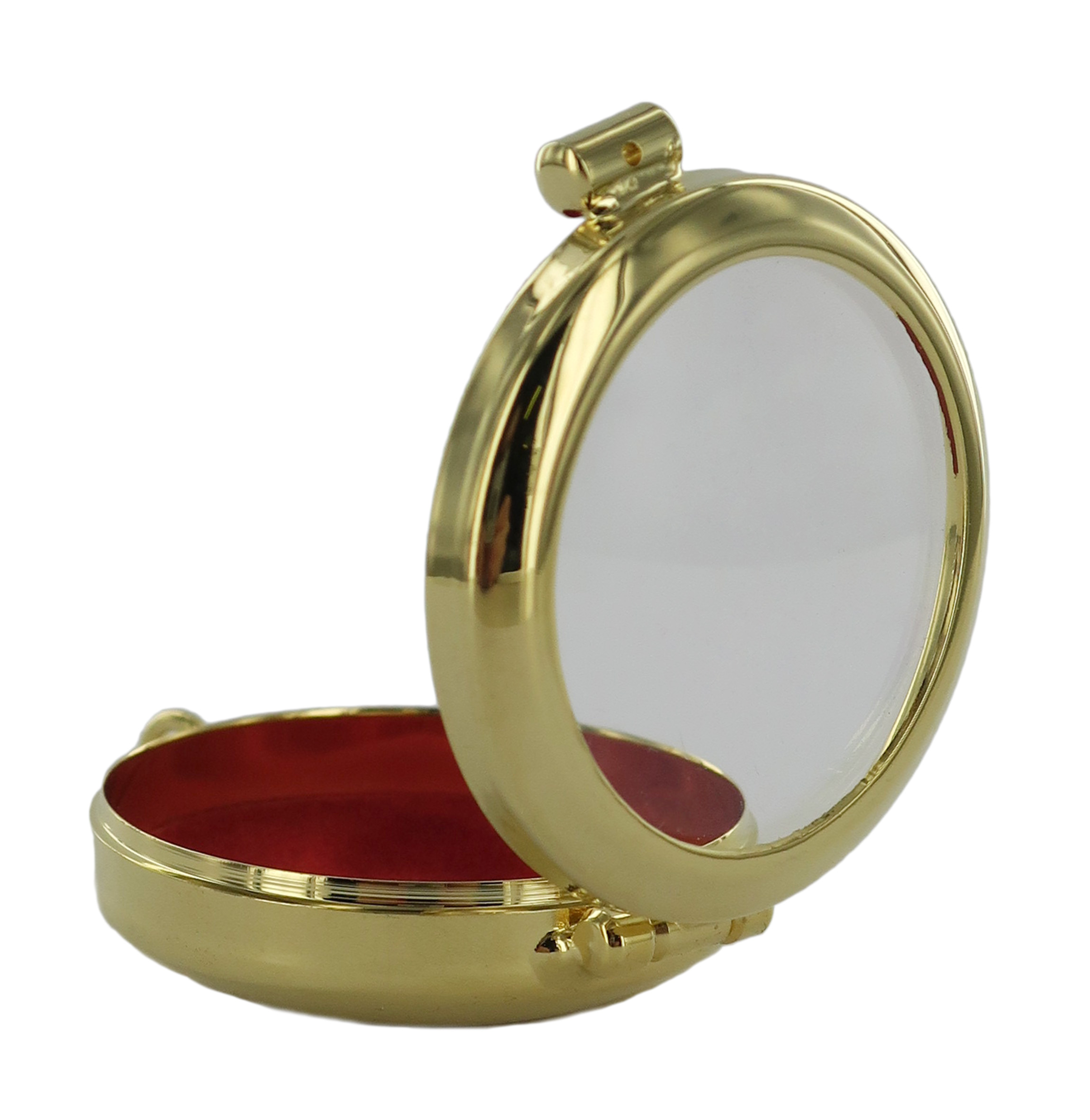 Portareliquie rotonda con diametro di 4 cm. L'alloggiamento, con fondo rosso in tessuto, ha una profondità di circa 14mm e una finestra tonda trasparente di 3,2 cm di diametro. Realizzato in Italia.