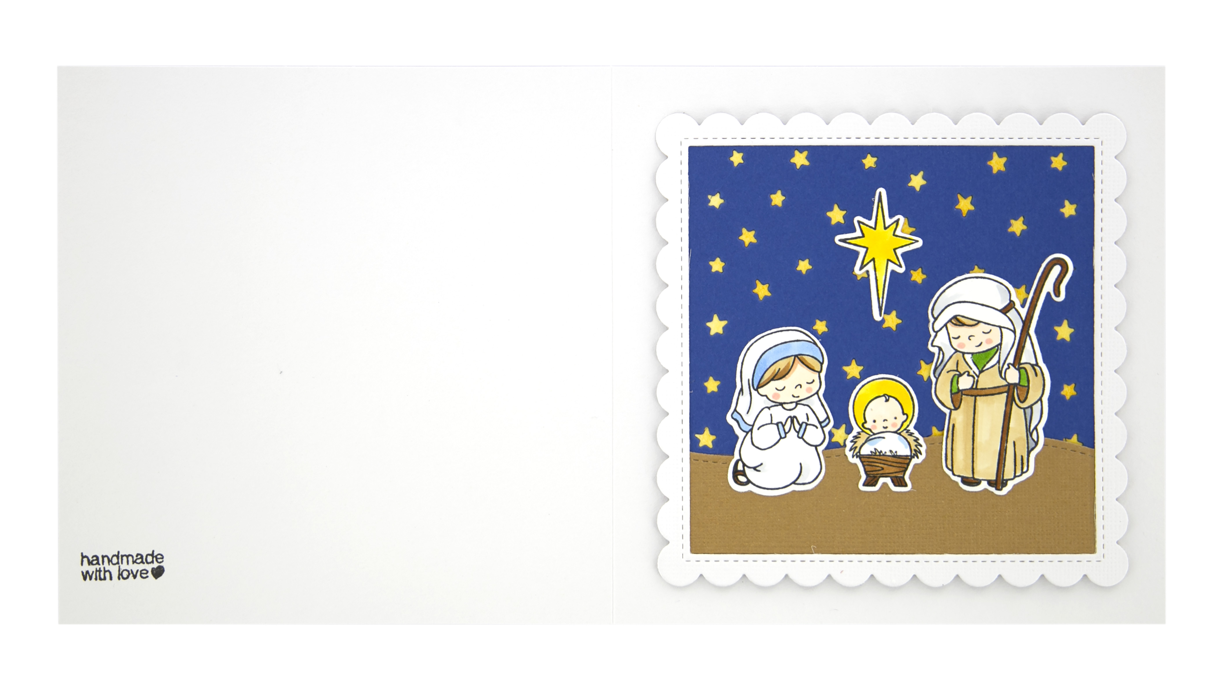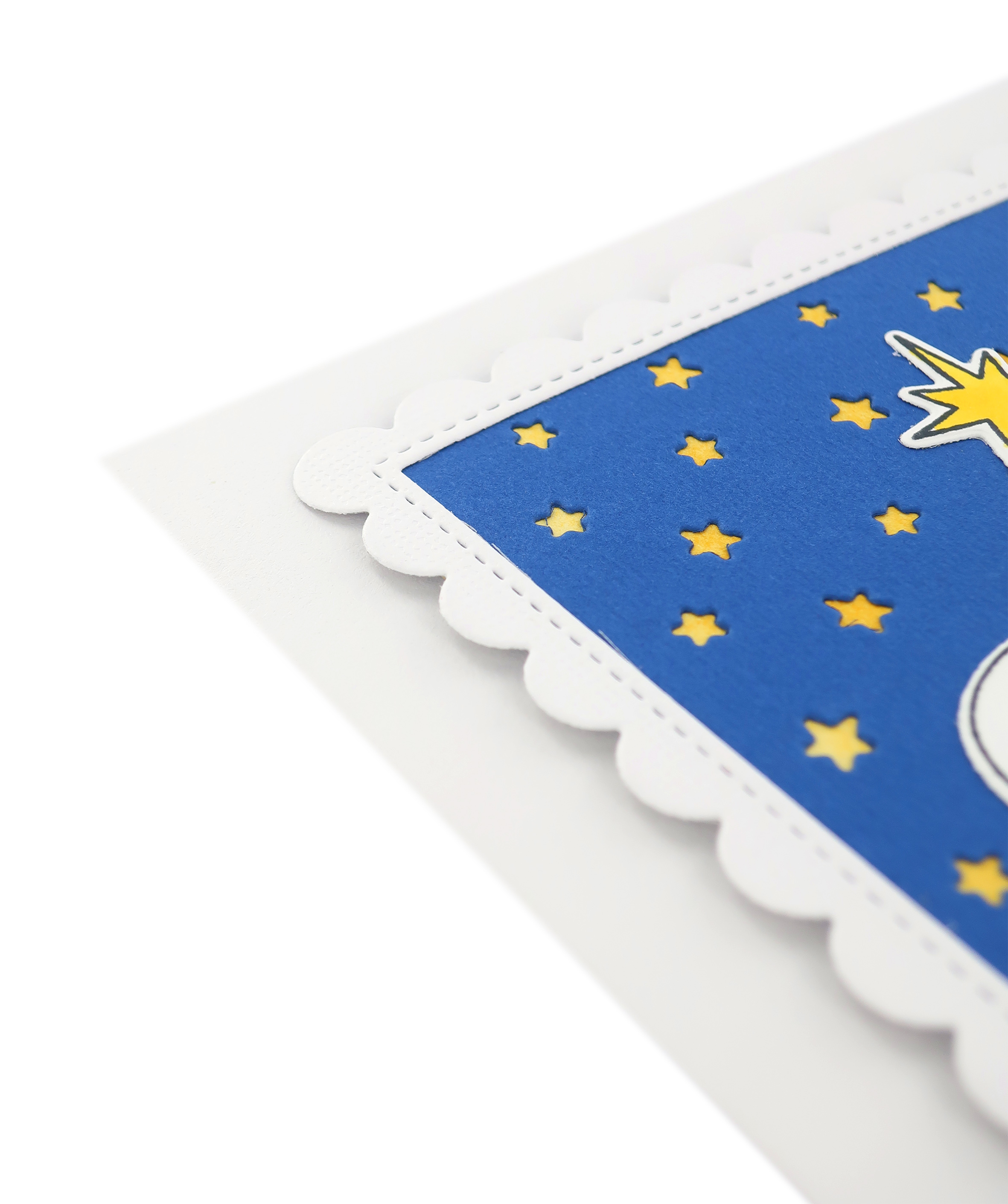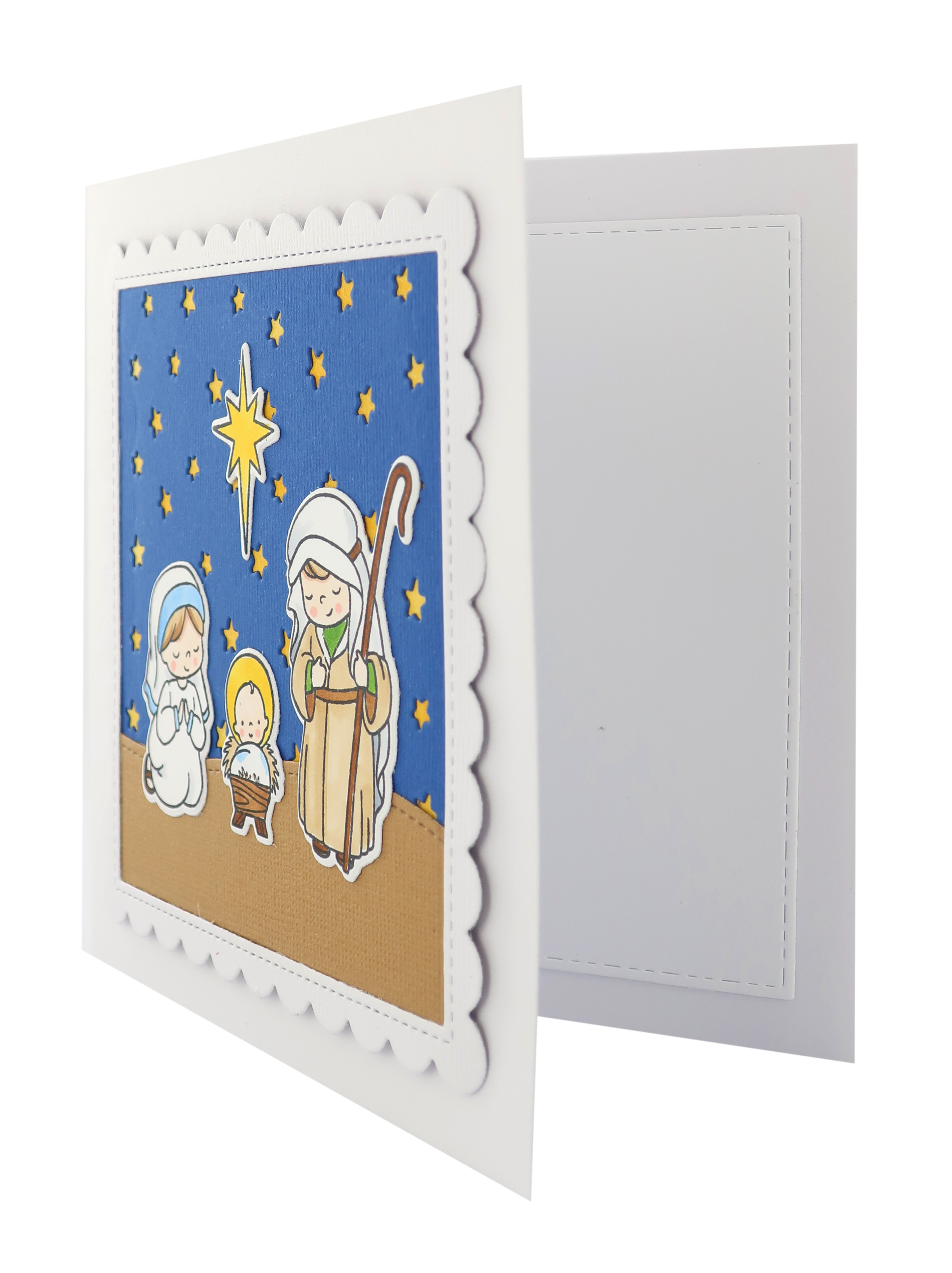 Nell'altro, senza alcuna scritta, Maria e Giuseppe adorano Gesù Bambino sotto un cielo stellato, in cui la stella cometa si staglia luminosa. La rappresentazione vanta una suggestiva tridimensionalità, grazie alle stelle gialle intagliate nel cartoncino blu che sembrano in lontananza rispetto alle altre figure che, in rilievo, appaiono in primo piano. Il biglietto può anche essere esposto come piccolo presepe.