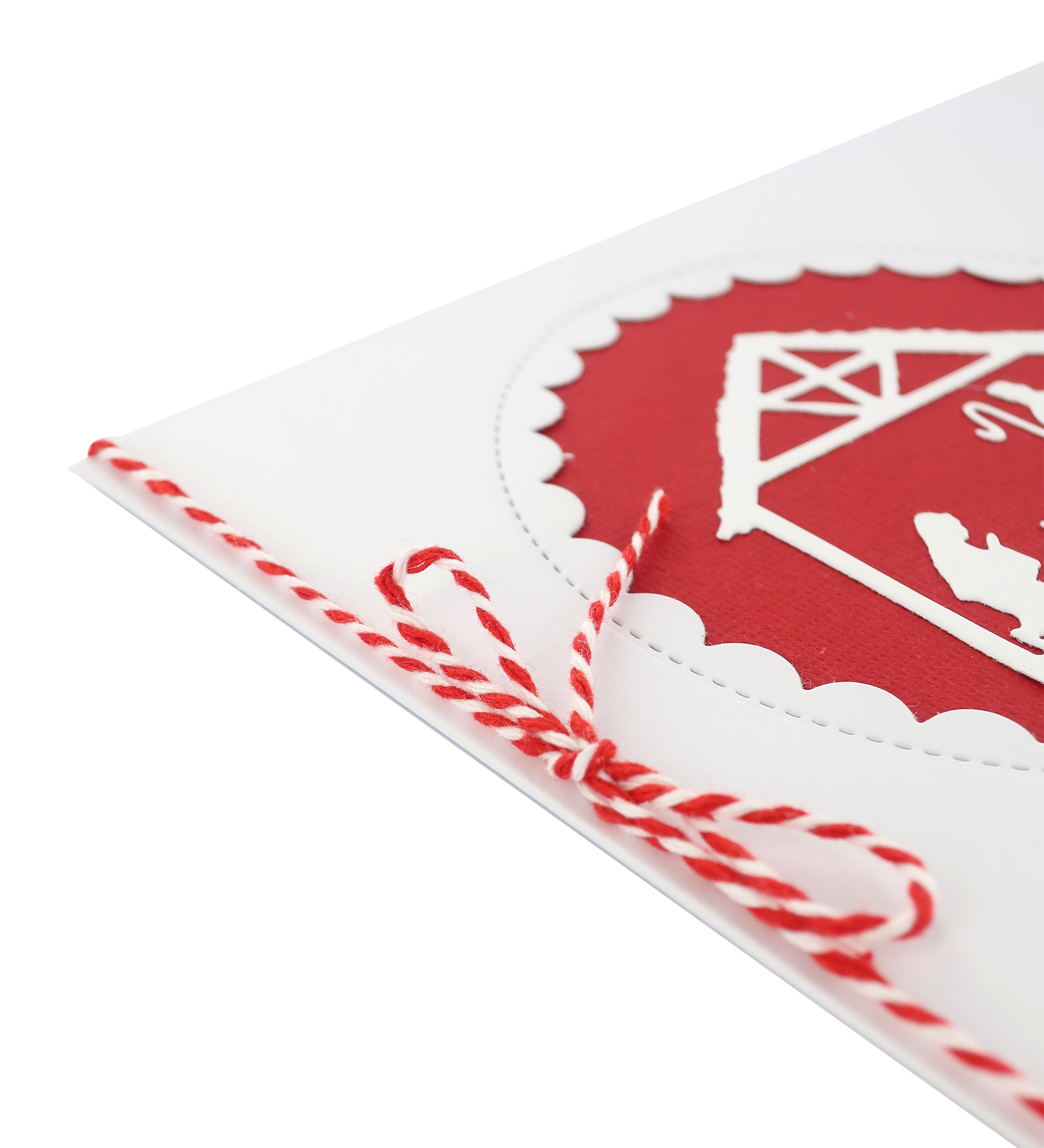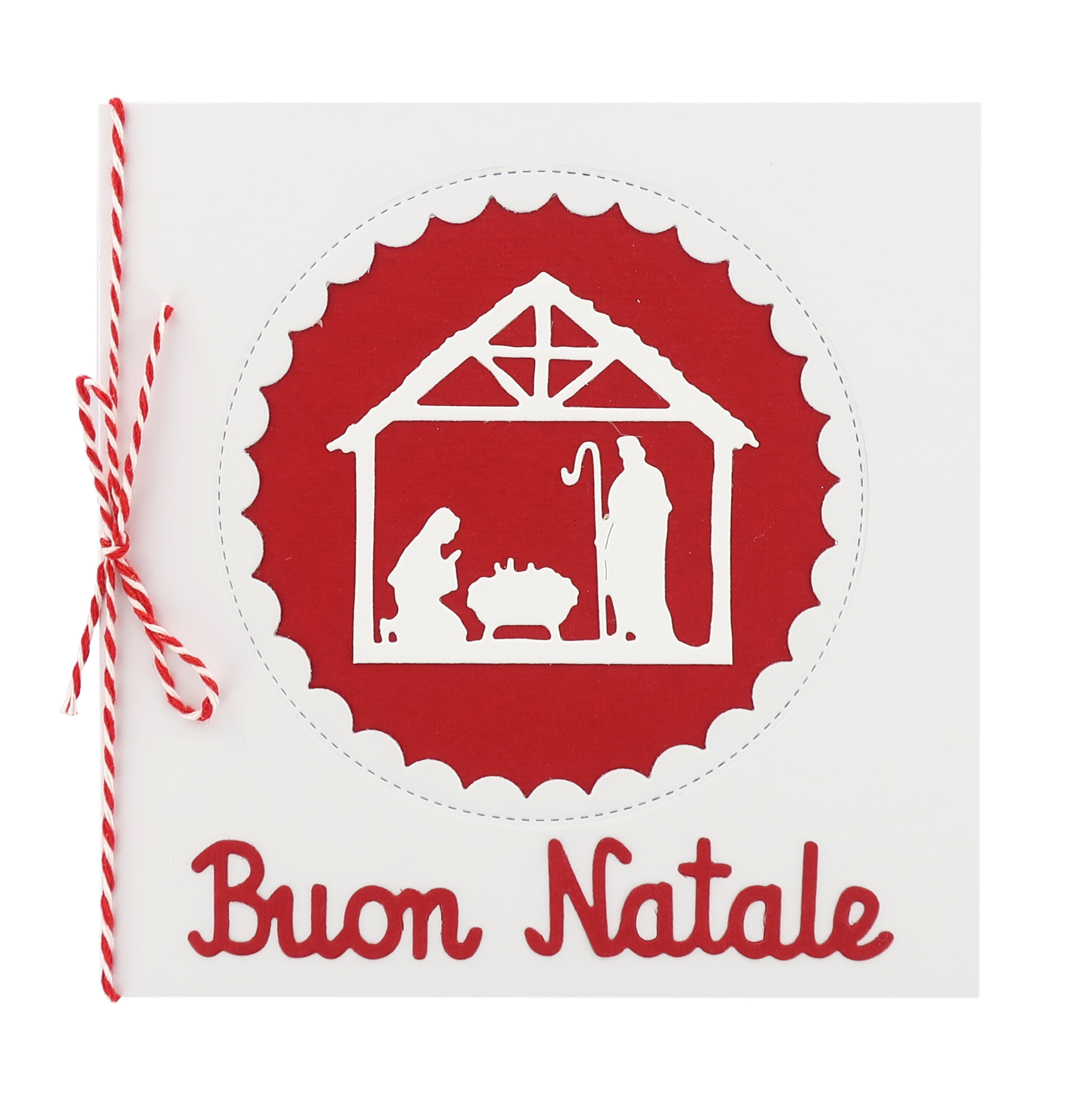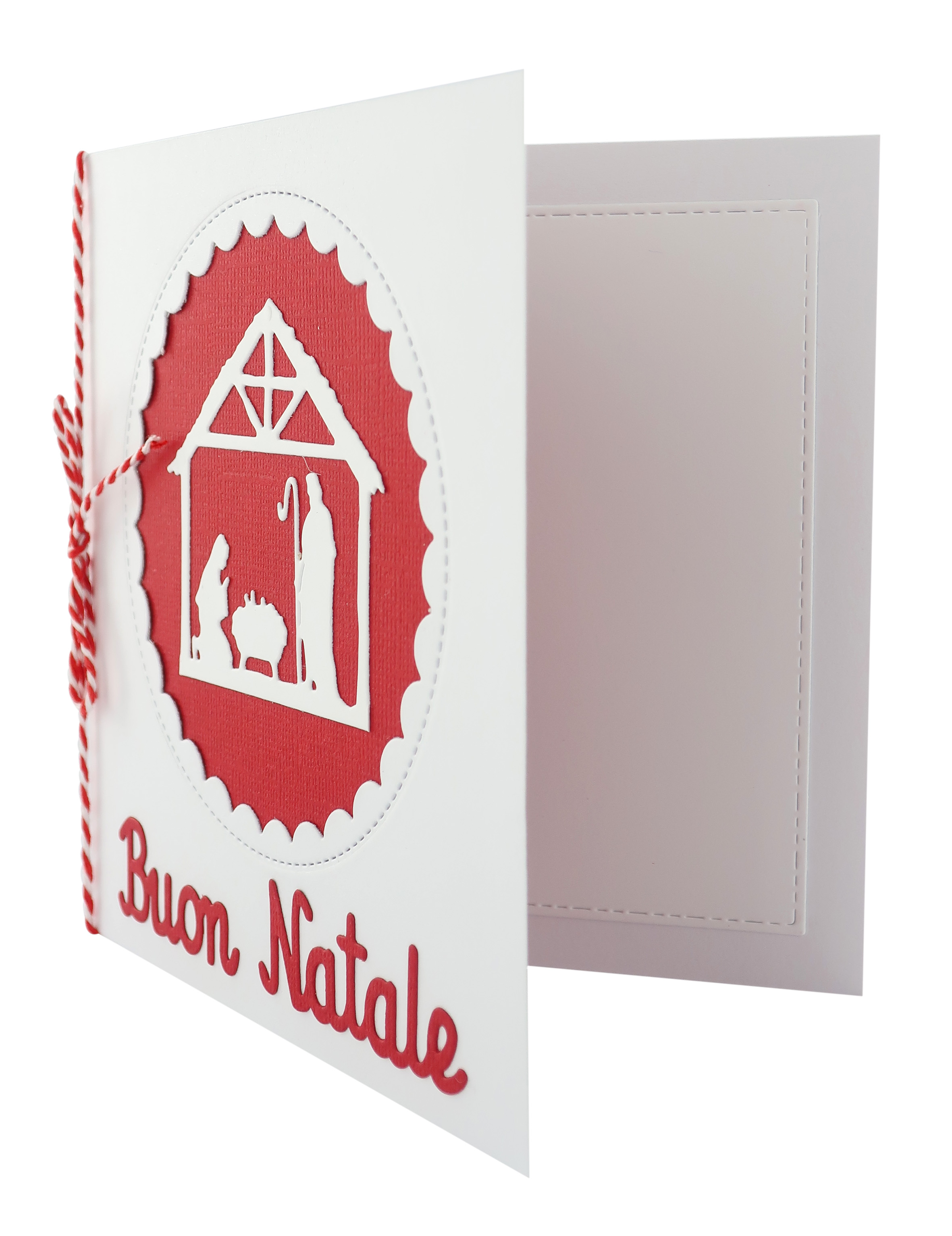 Uno appare più classico, con la scritta rossa in corsivo scolastico "Buon Natale" e la Sacra Famiglia nella capanna, in cartoncino bianco intagliato e applicato su sfondo rosso. Sul lato destro, un cordoncino bianco e rosso annodato a fiocco rende il biglietto più bello.
