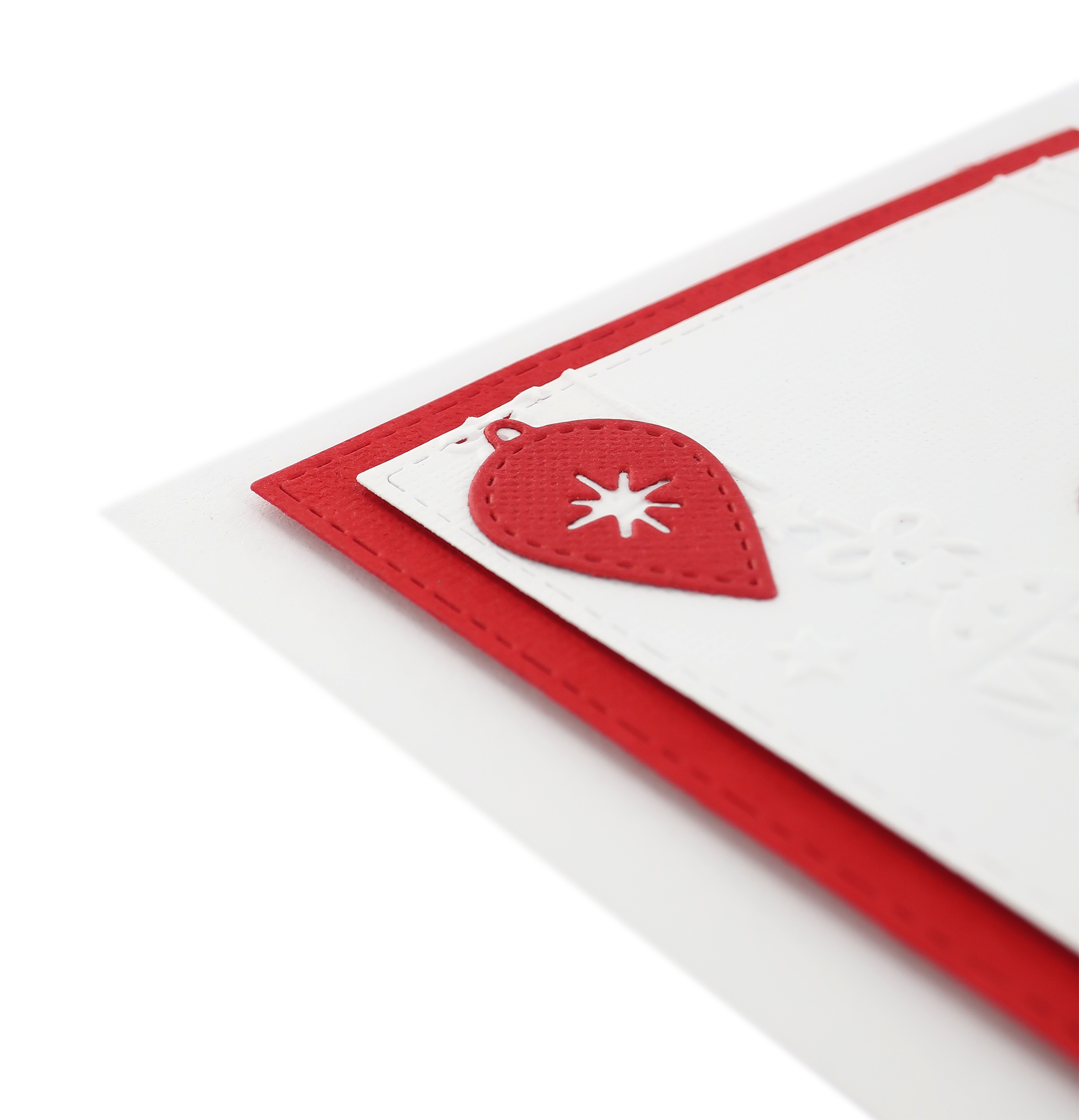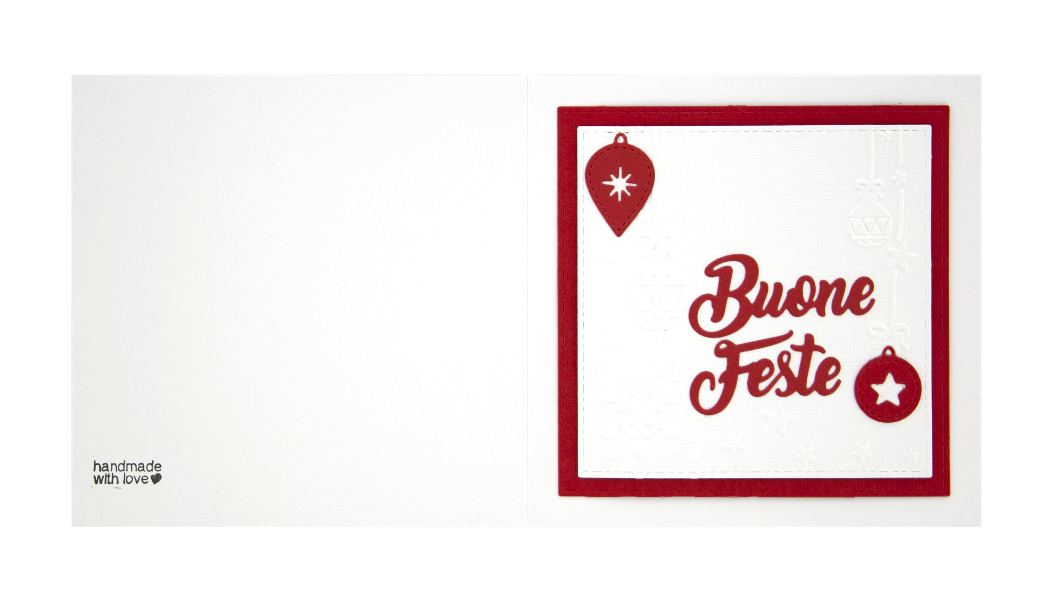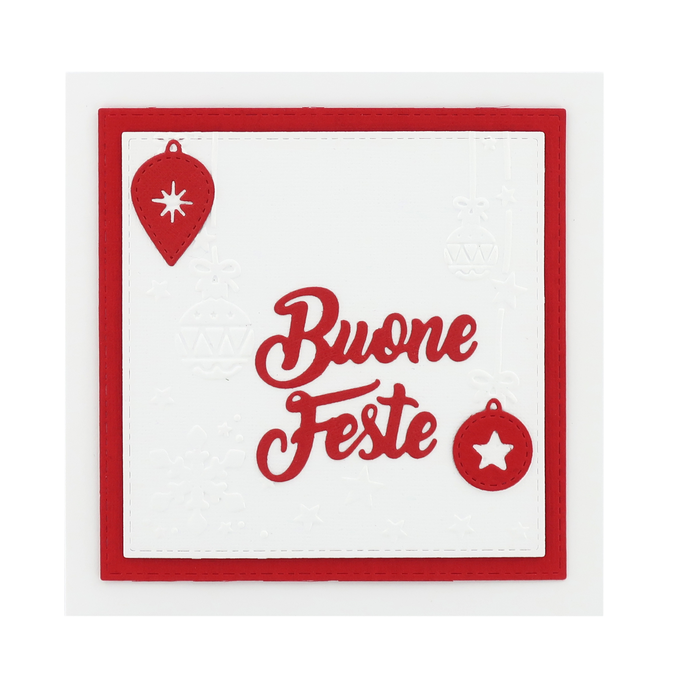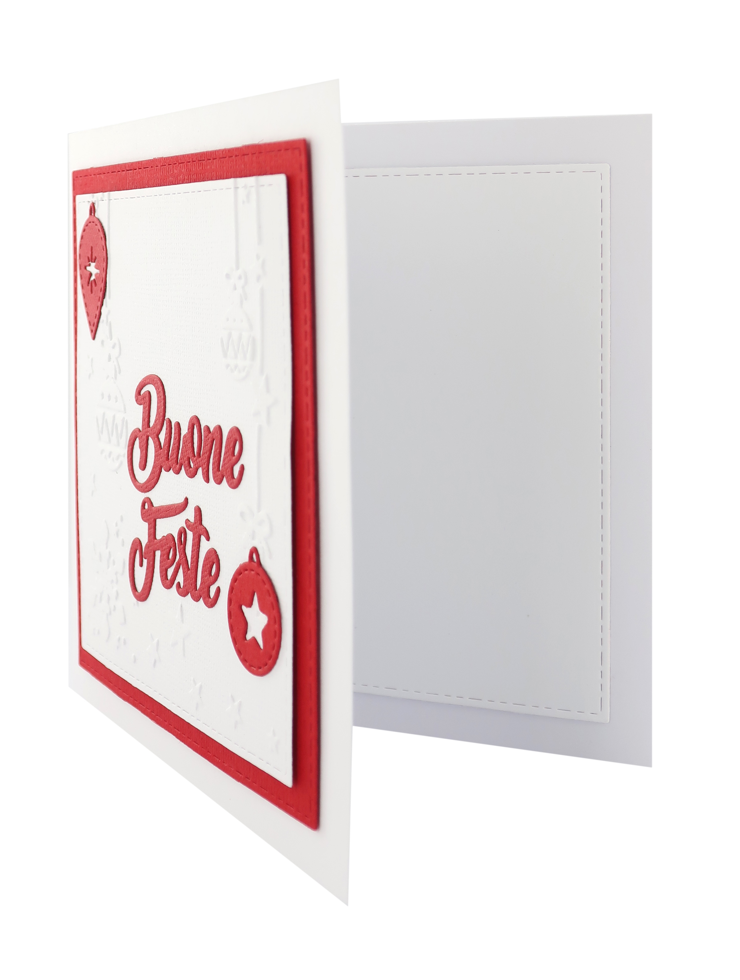 Un biglietto, dallo stile più semplice, riporta la scritta "Buone Feste" in cartoncino rosso in rilievo insieme a due decori tipici dell'albero di Natale. Lo sfondo bianco centrale, incorniciato da un bordo rosso, riproduce fiocchi di neve e palline per l'albero in rilievo. Una cornice verde racchiude questa scena.