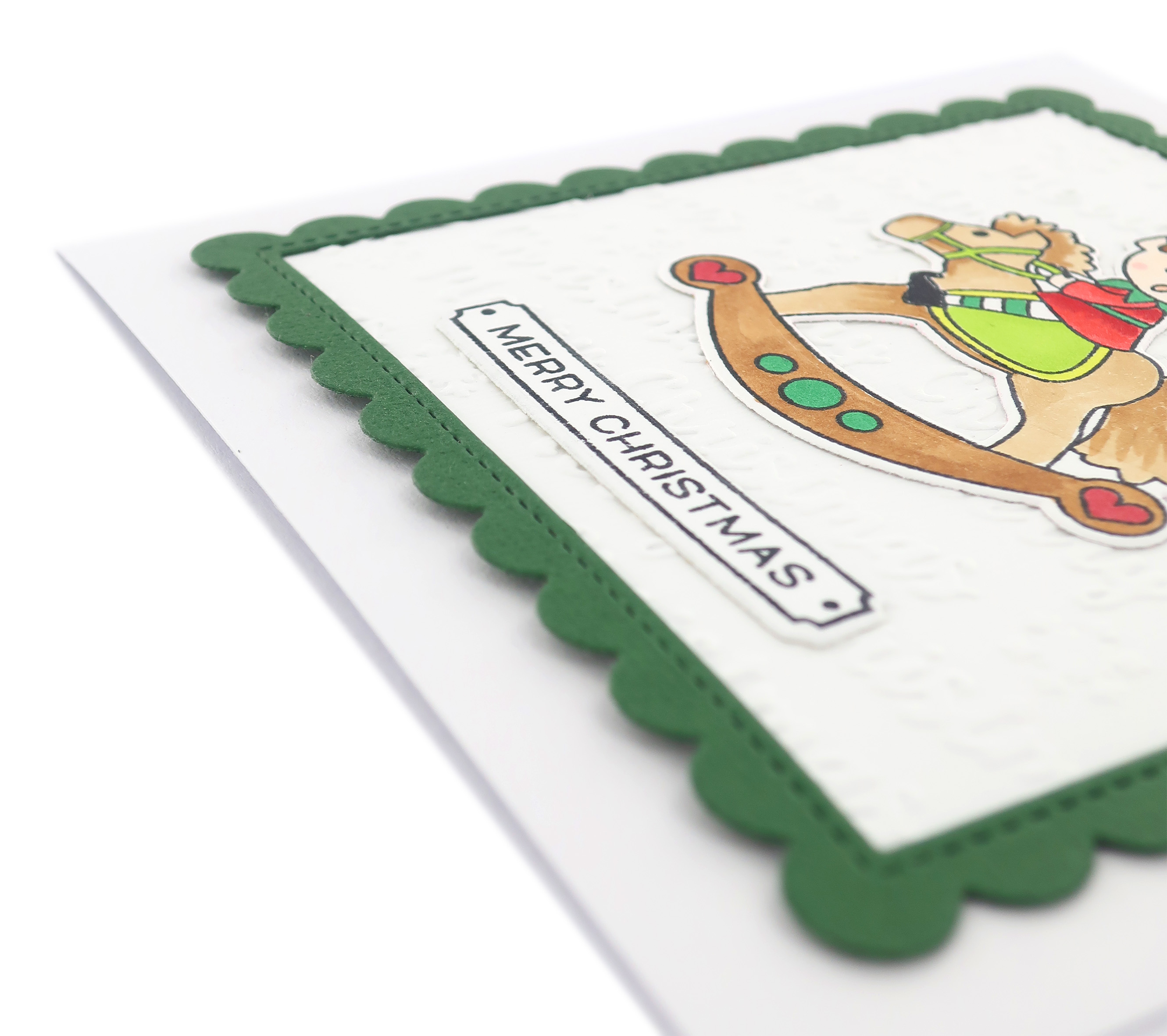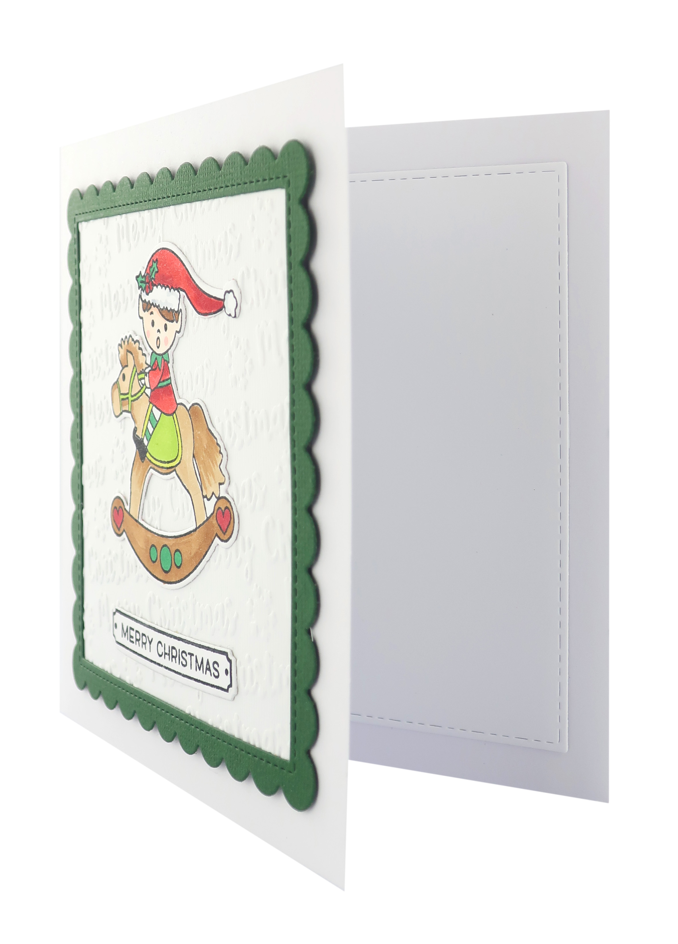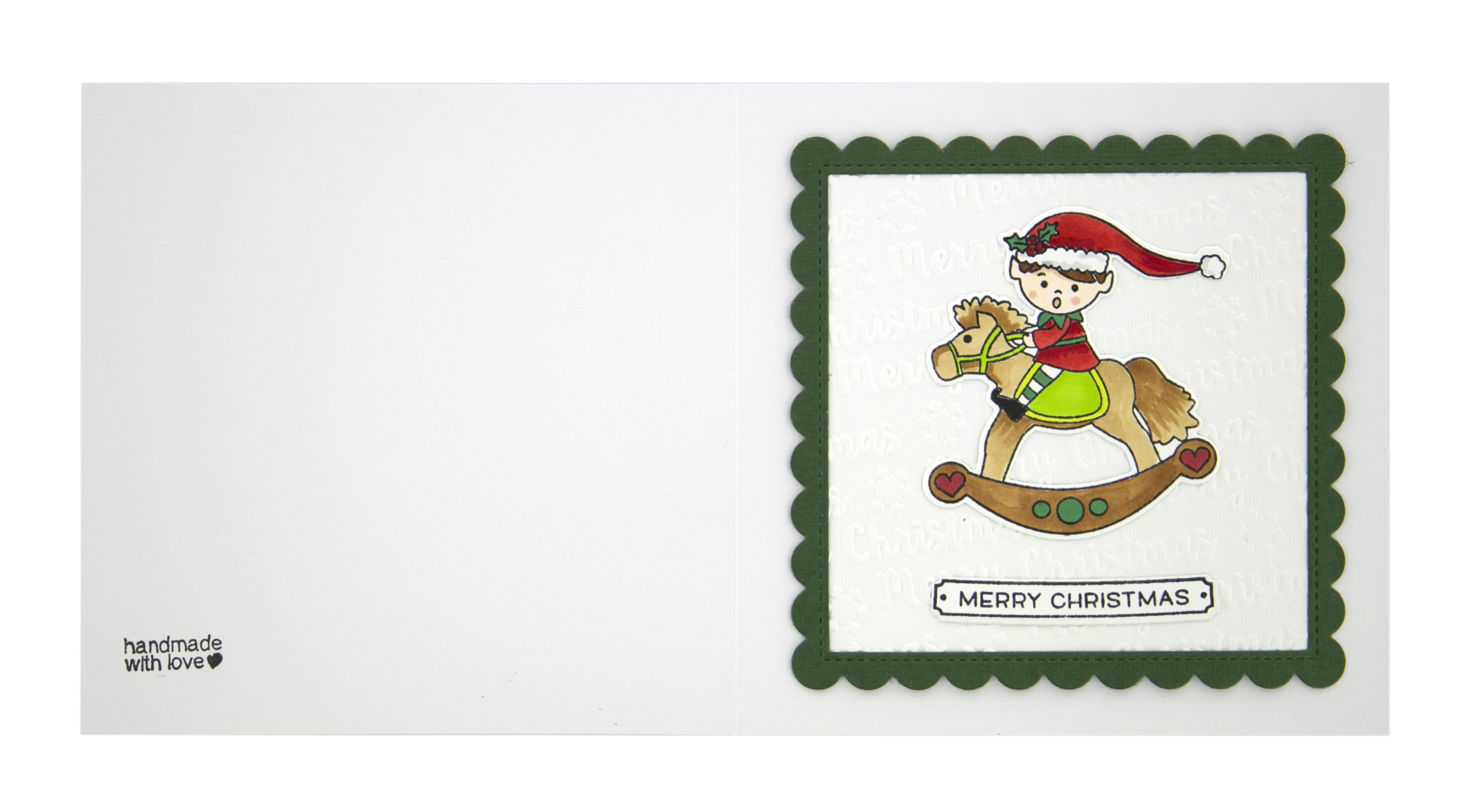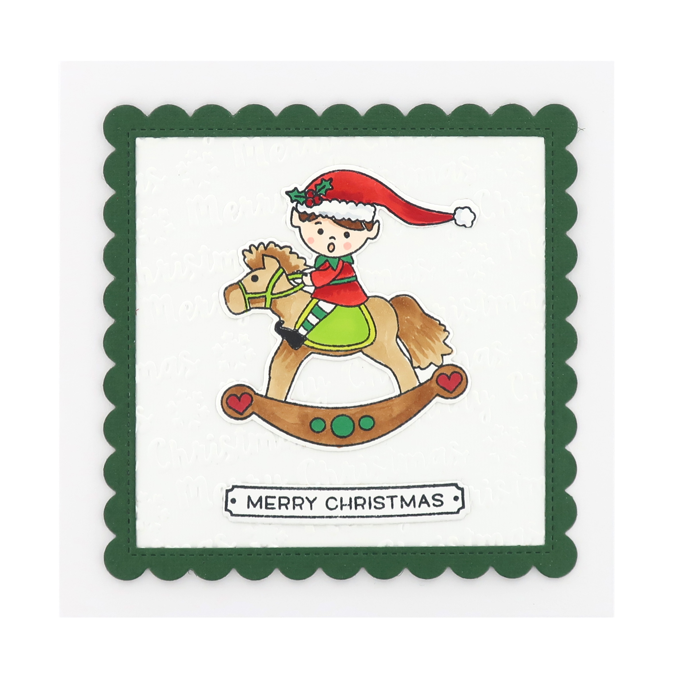 Nell'altro, che vanta la piccola scritta "Merry Christmas" a mo' di targhetta su sfondo bianco dove ripete la scritta Merry Christmas in rilievo, è raffigurato un simpatico elfo che si diverte su un cavallo a dondolo. Una cornice verde dal bordo frastagliato racchiude questa scena giocosa.