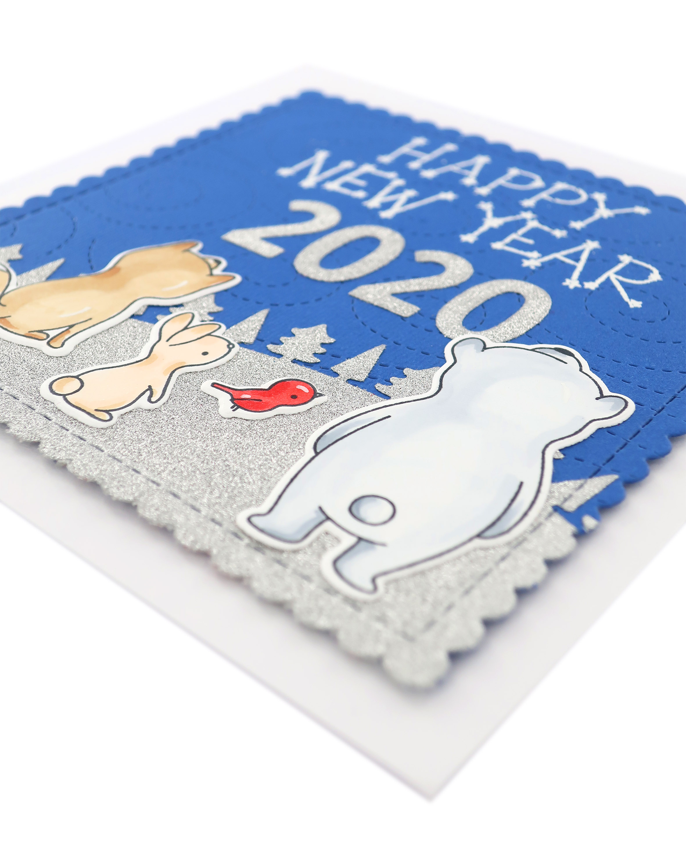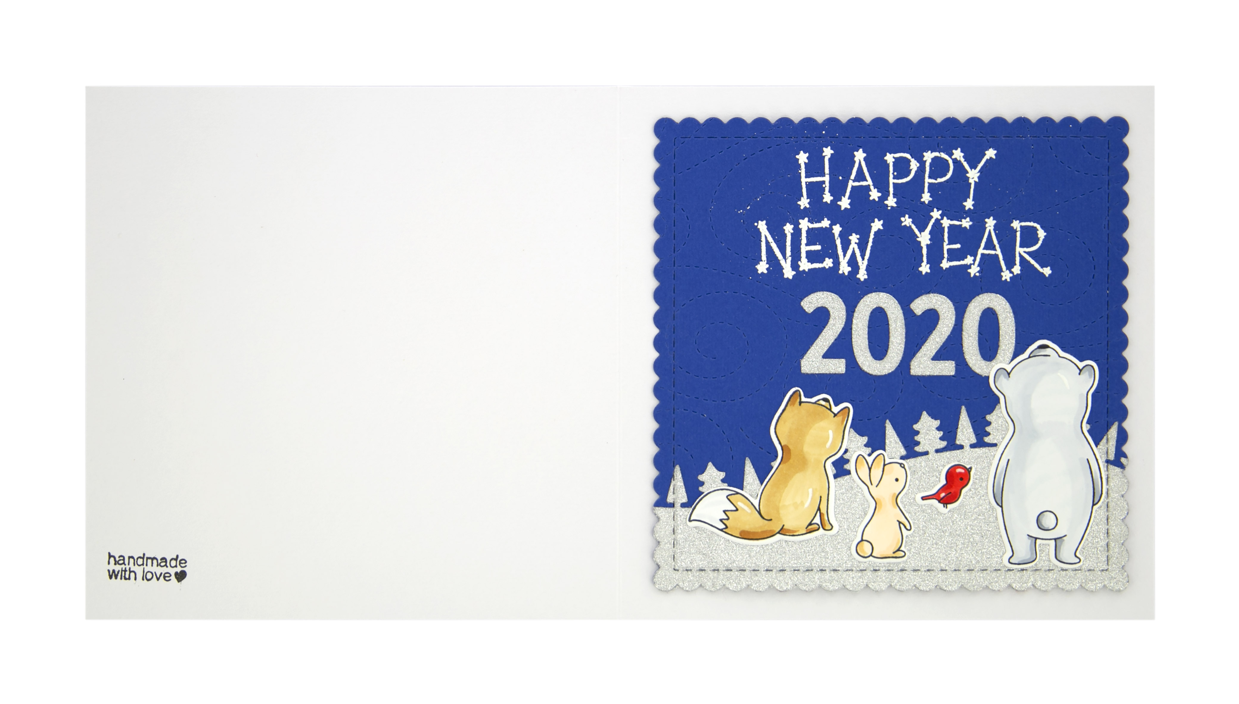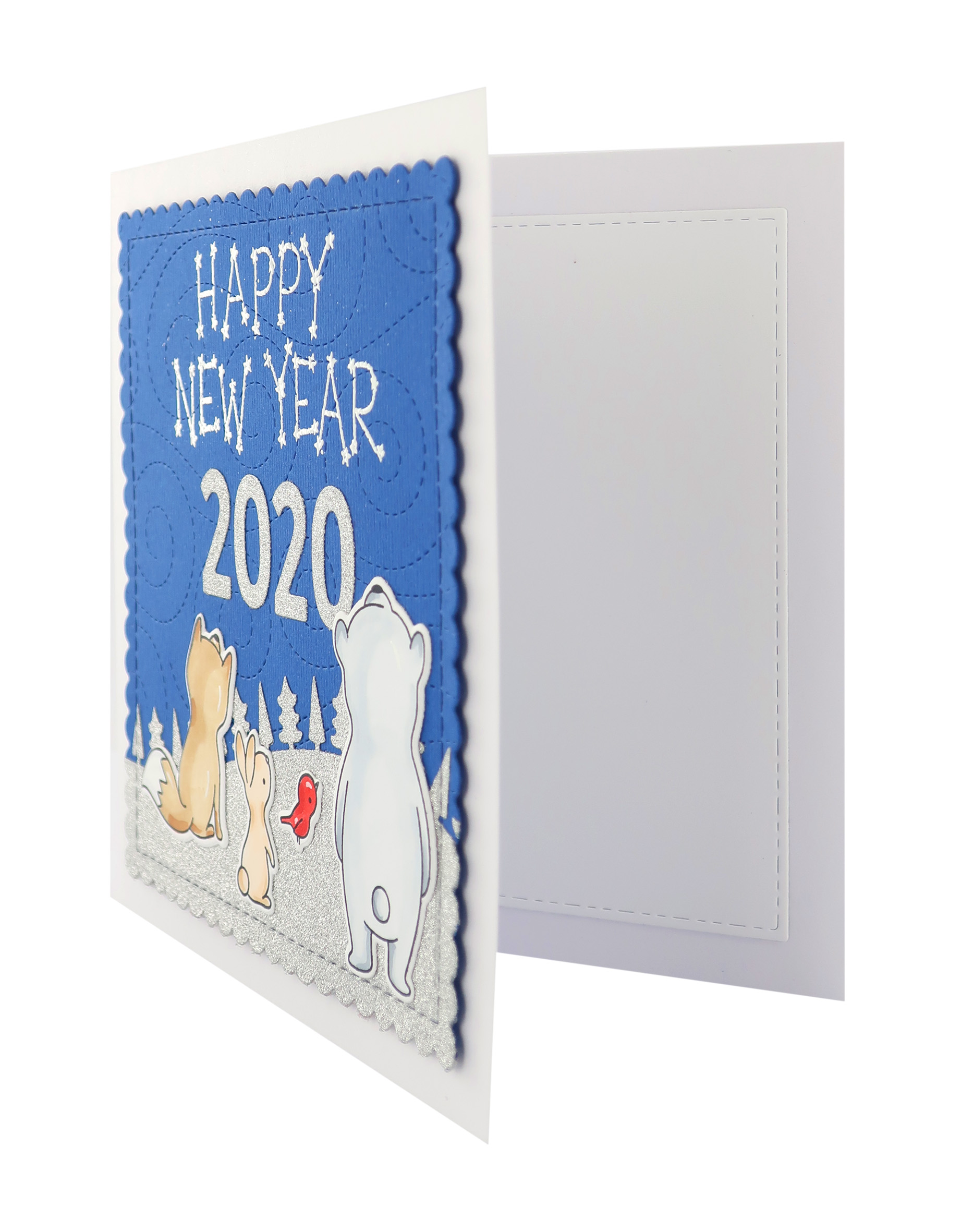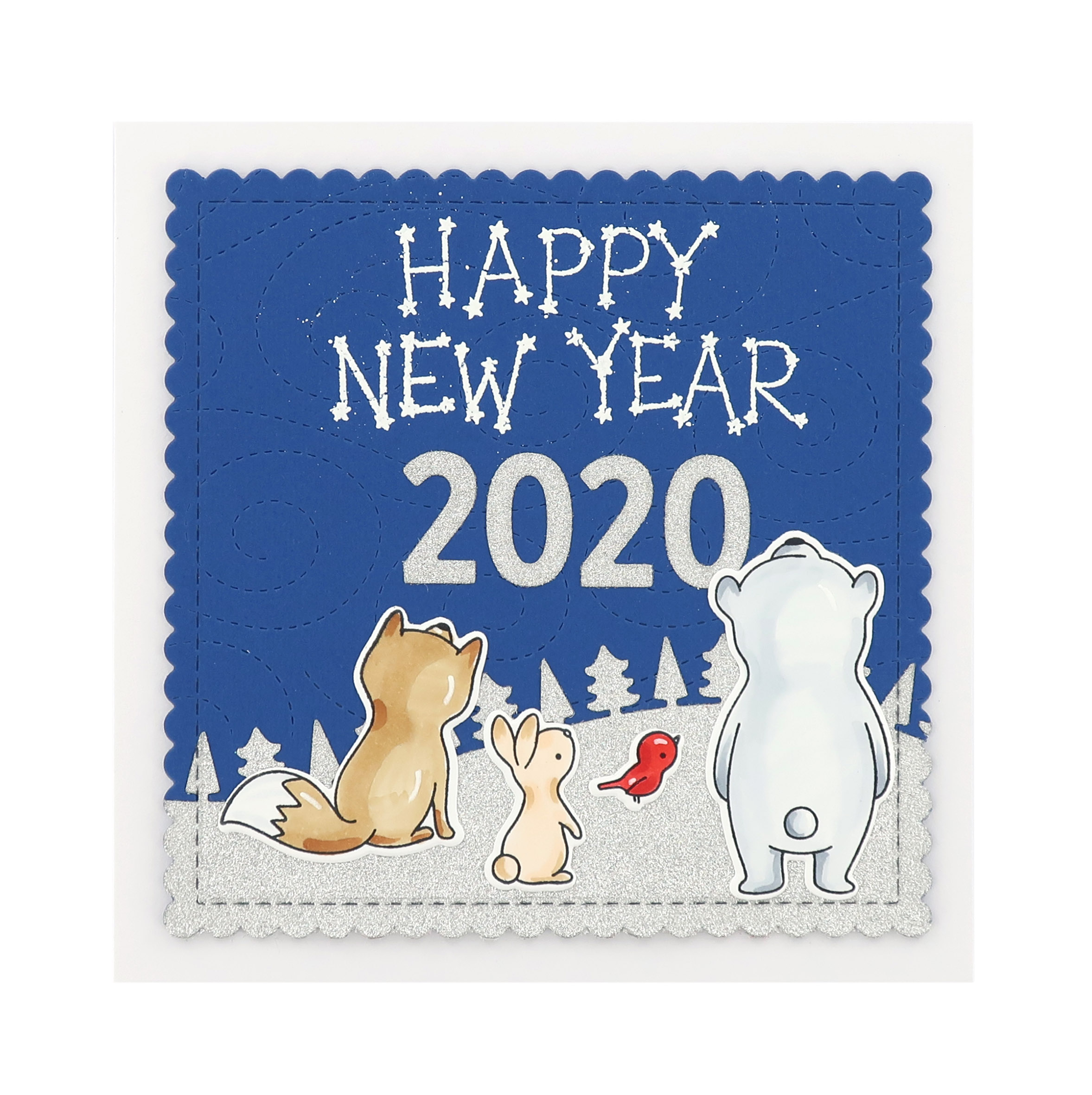 Uno raffigura l’ultima notte dell’anno e 4 simpatici amici: una volpe, un coniglio, un pettirosso e un orso. Immersi in un paesaggio innevato che brilla grazie al cartoncino con glitter, ammirano il cielo in cui compare l'augurio Happy New Year tracciato dalle stelle e la scritta 2020 glitterata.