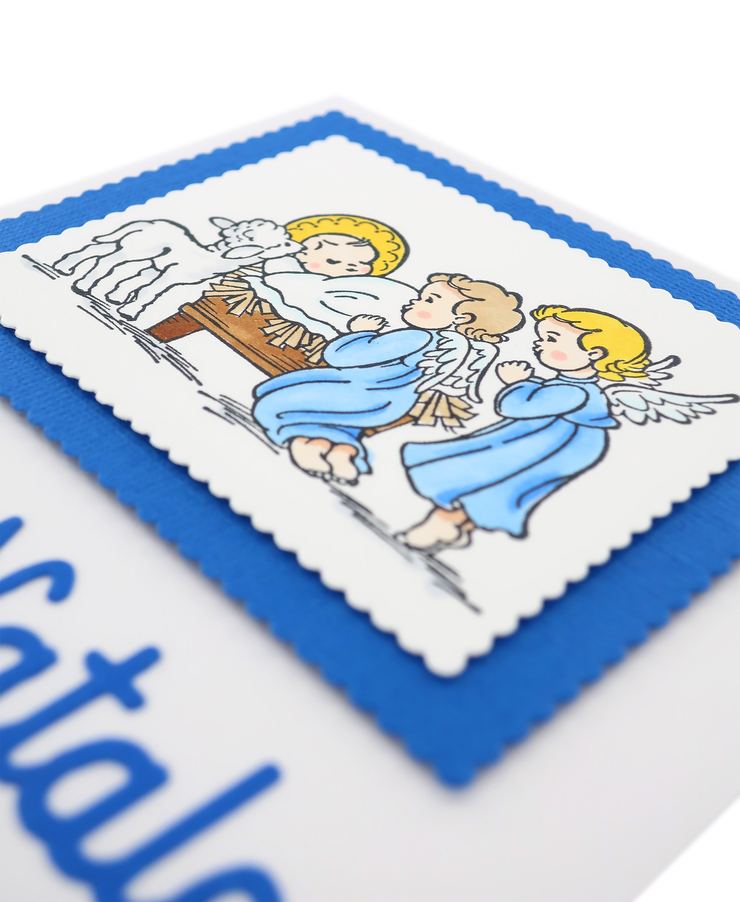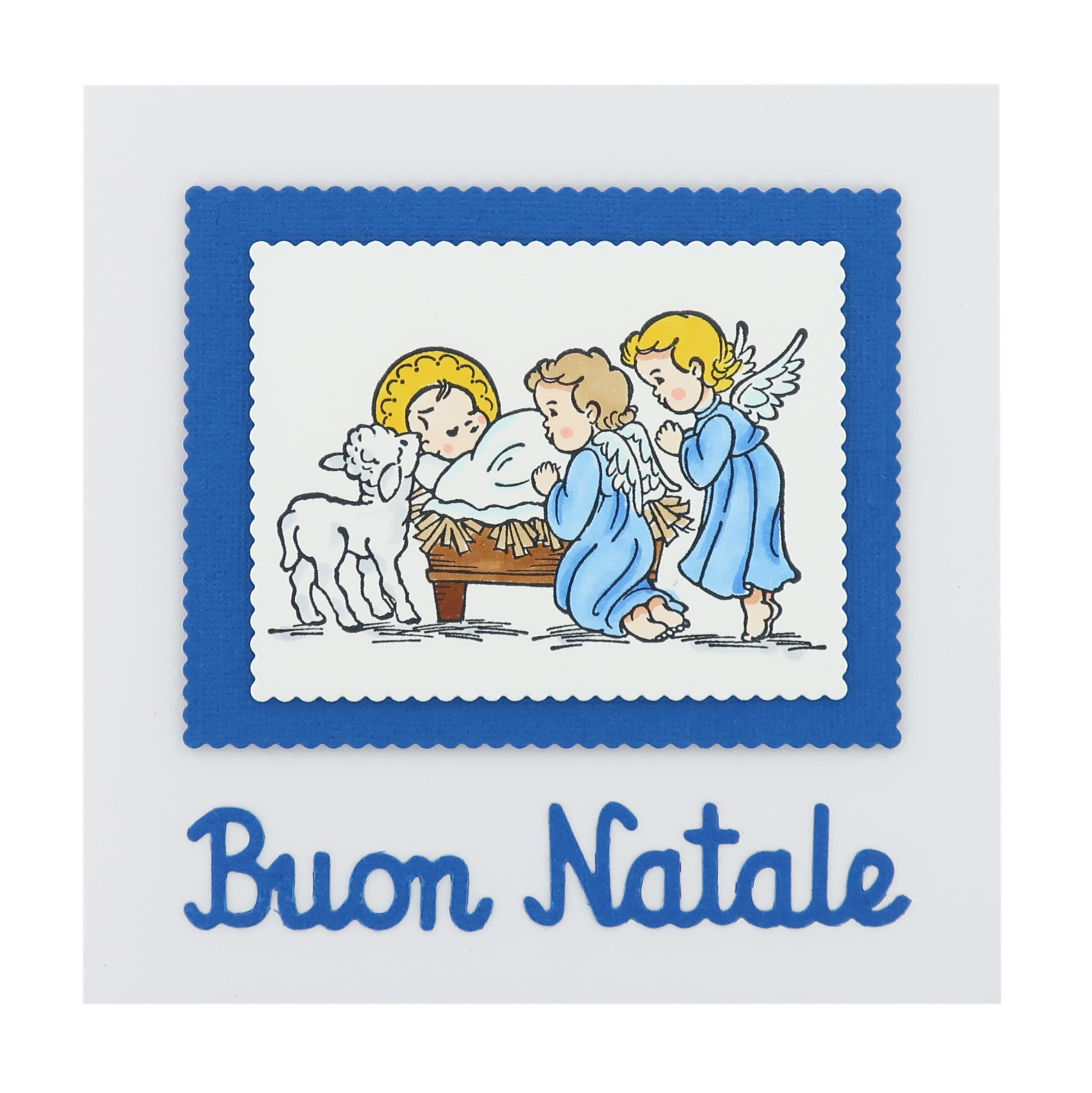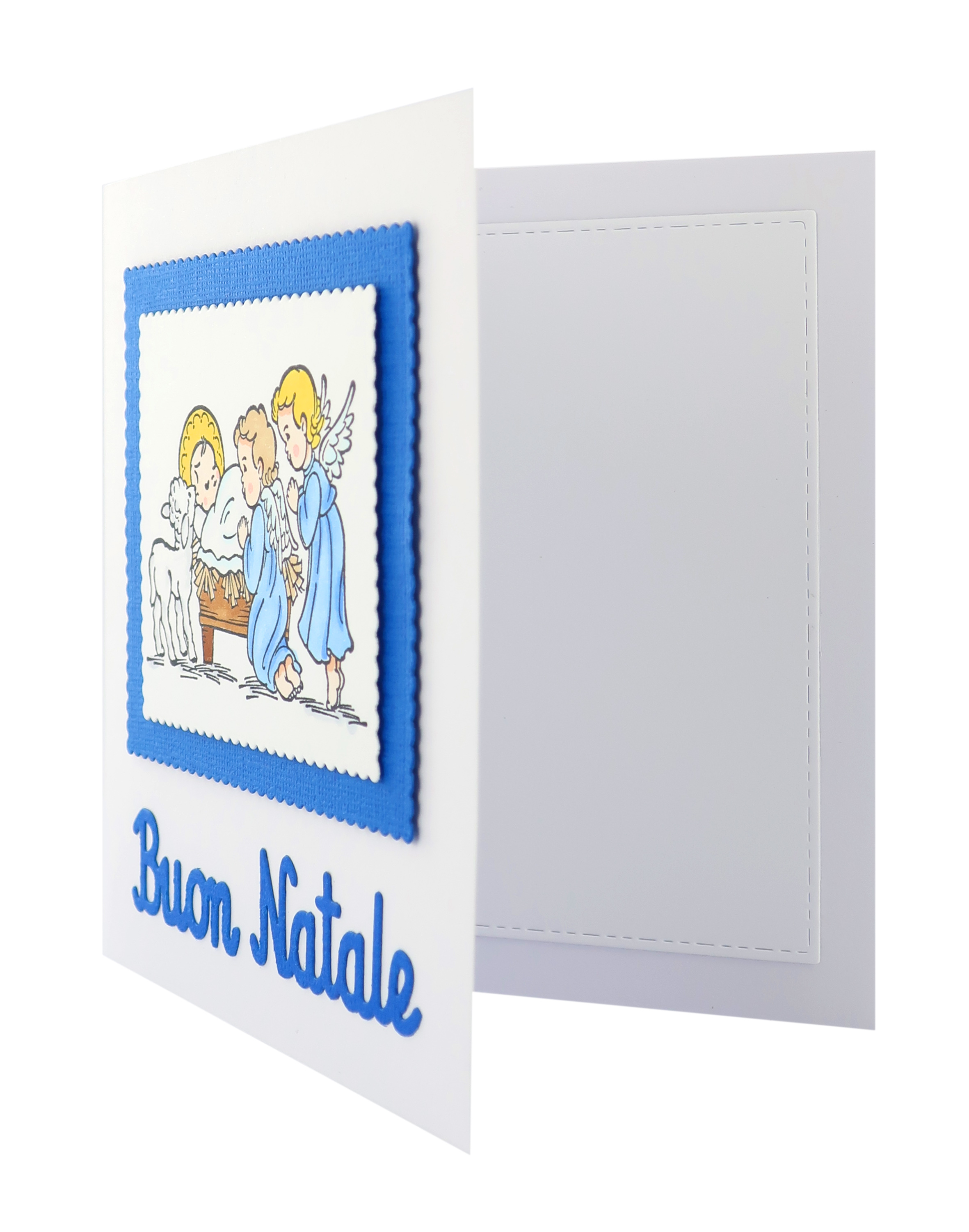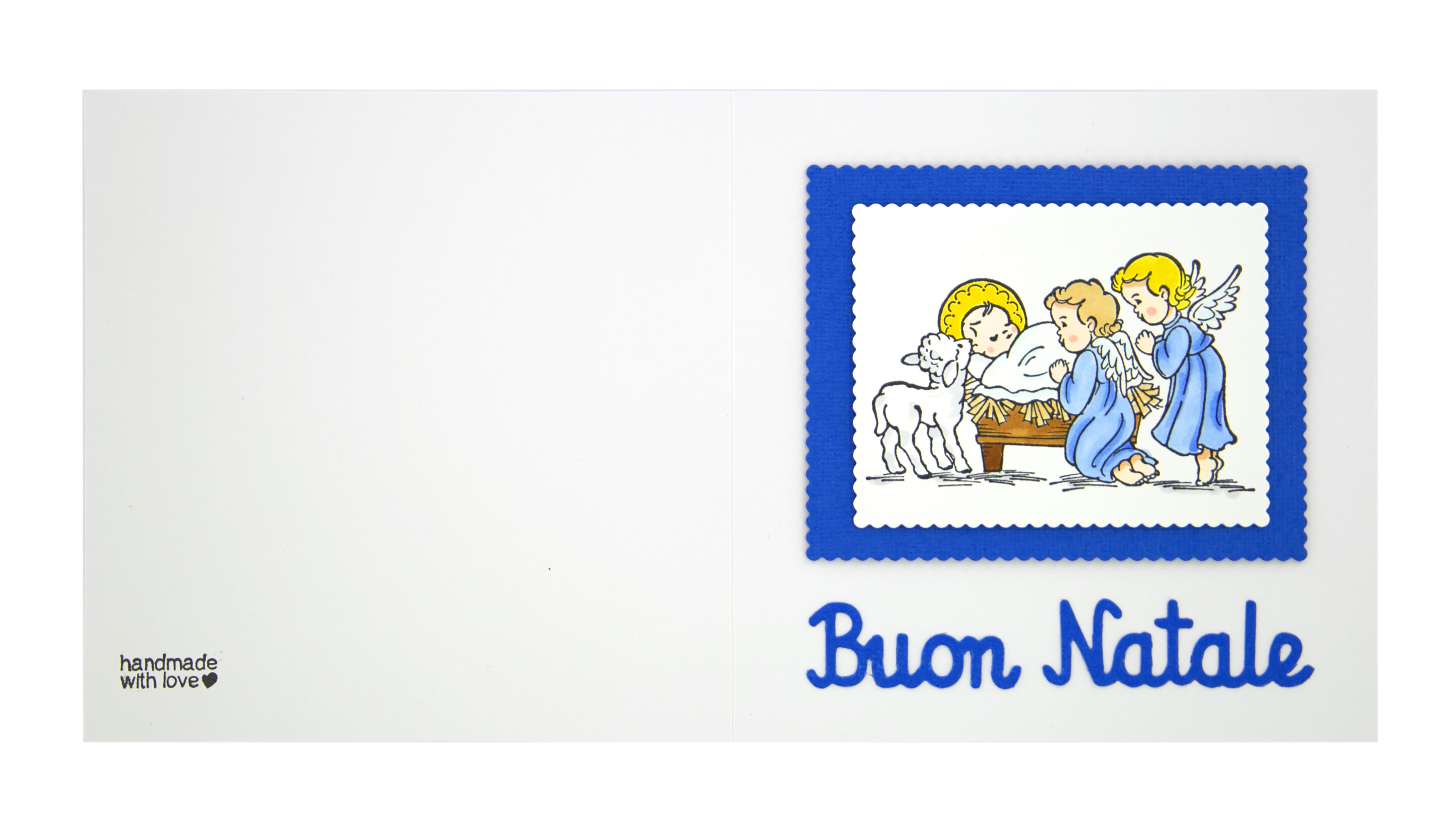 Nell'altro, dallo stile più classico, la scritta Buon Natale in corsivo blu accompagna due angioletti e un agnello che adorano Gesù Bambino nella culla. La scena è incorniciata da un cartoncino blu dai bordi frastagliati, che ne esalta i soggetti.