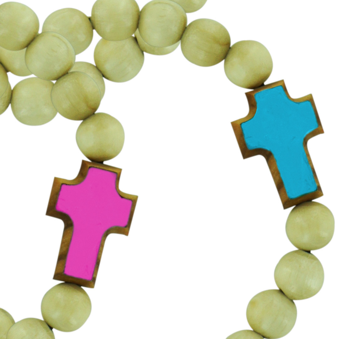 Il braccialetto in legno chiaro con 20 grani del diamento 7, un grano ovale più grande ed una crocietta in ulivo di cm 1,9 di colore verde, azzurro e fucsia.