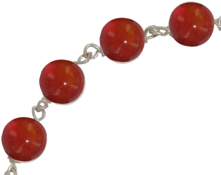 Il bracciale decina è incatenato a girello con filo in argento 925 e con 11 grani in corniola. Una medaglietta in argento che misura cm 1 e rappresenta la Vergine Miracolosa chiude il bracciale.