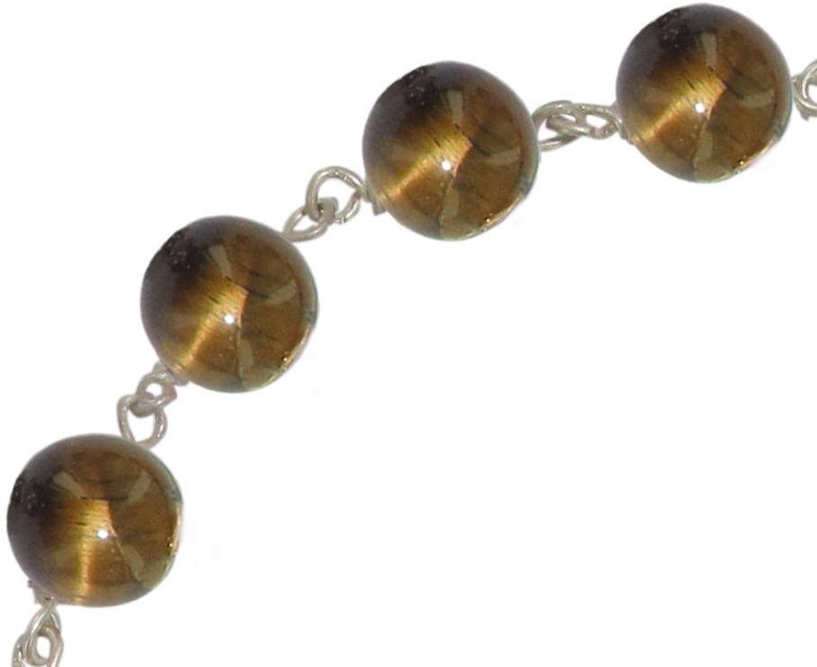 Il bracciale decina è incatenato a girello con filo in argento 925 e con 11 grani in occhio di tigre. Una medaglietta in argento che misura cm 1 e rappresenta la Vergine Miracolosa chiude il bracciale.