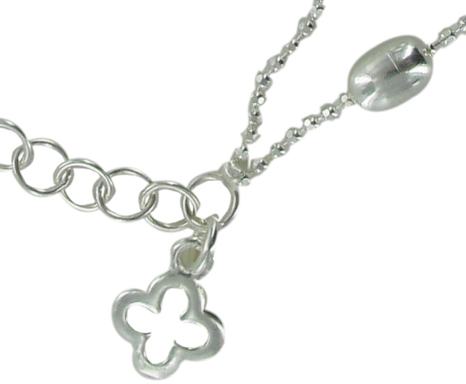Il braccialetto ha doppia catena in argento, impreziosito da 9 grani ovali da 2 mm. Il braccialetto è arricchito da un pendente traforato a forma di trifoglio. La lunghezza misura 18 cm e la circonferenza è di 14 cm. Il peso è 3 gr.
