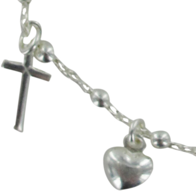 Bracciale in argento 925 con grani tondi mm 1 e pendenti a forma di croce e cuore