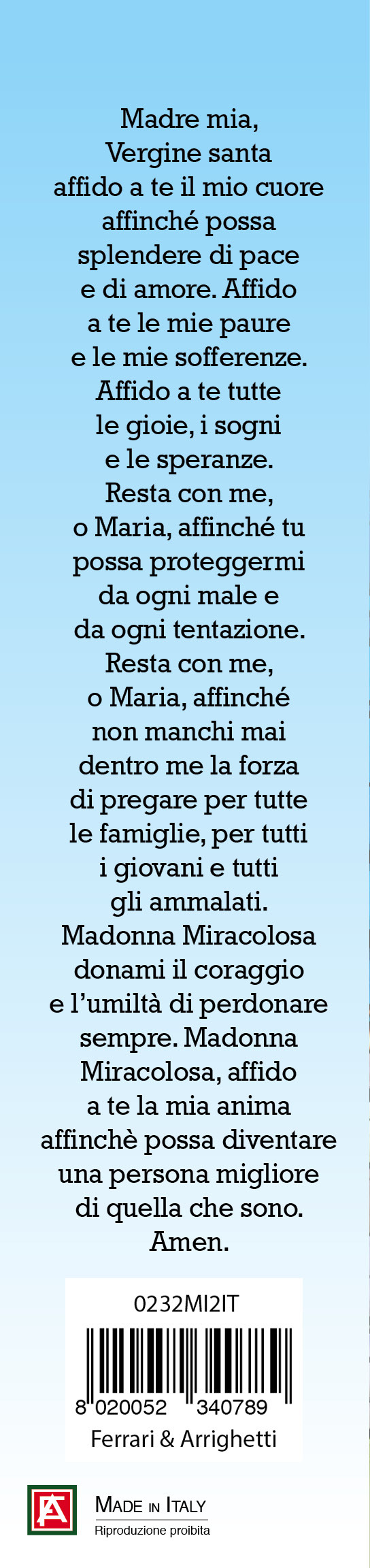E' confezionato in un cartoncino con l'immagine della Madonna Miracolosa, sul retro vi è una preghiera dedicata a lei il tutto infilato in una busta trasparente.