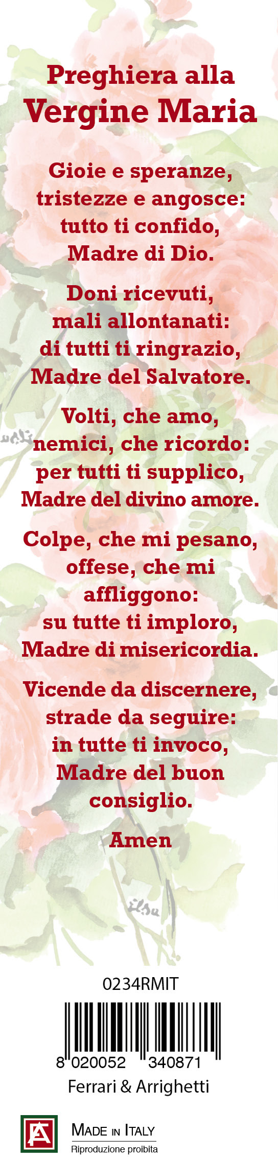 E' confezionato in un cartoncino con l'immagine della Rosa Mistica, sul retro vi è una preghiera dedicata a lei il tutto infilato in una busta trasparente.