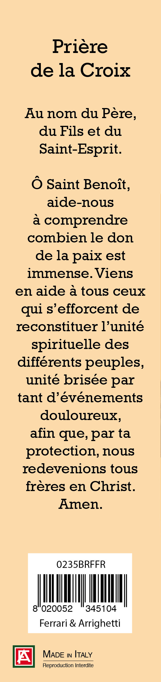 E' confezionato in un cartoncino con l'immagine di San Benedetto, sul retro vi è una preghiera dedicata a lui, il tutto infilato in una busta trasparente.