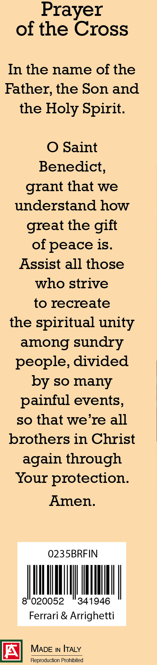 E' confezionato in un cartoncino con l'immagine di San Benedetto, sul retro vi è una preghiera dedicata a lui, il tutto infilato in una busta trasparente.