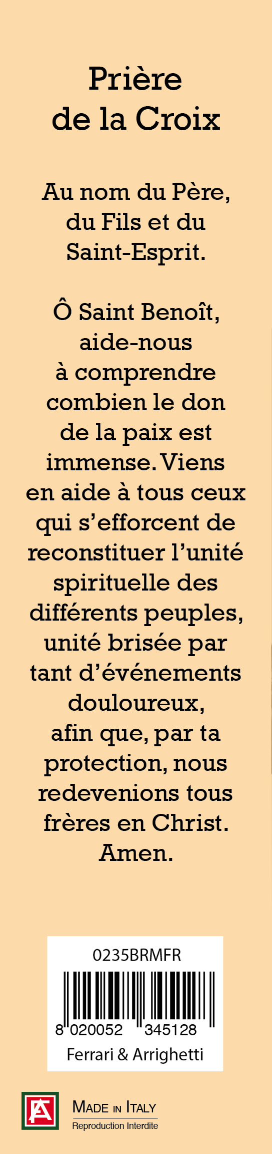 E' confezionato in un cartoncino con l'immagine di San Benedetto, sul retro vi è una preghiera dedicata a lui, il tutto infilato in una busta trasparente.