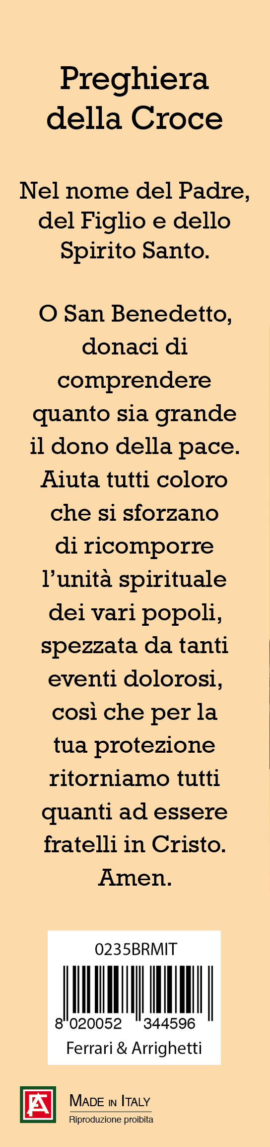 E' confezionato in un cartoncino con l'immagine di San Benedetto, sul retro vi è una preghiera dedicata a lui, il tutto infilato in una busta trasparente.