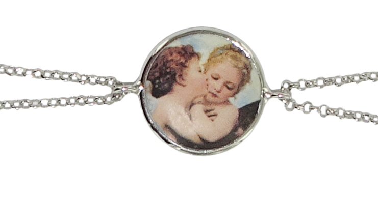 Questo delizioso braccialetto in argento 925% si presenta con al centro una delicata immagine di due volti di angioletti stampati su porcellana del diametro di cm 1,6.