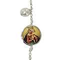 Questo delizioso braccialetto in argento 925% si presenta con al centro una delicata immagine della Madonna con il bambino in braccio stampata su porcellana del diametro di cm 1,5 e incastonato in un profilo di argento lucido.