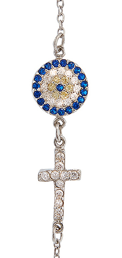 Braccialetto con croce e medaglia con strass bianchi e blu in argento 925 con bagno in oro bianco