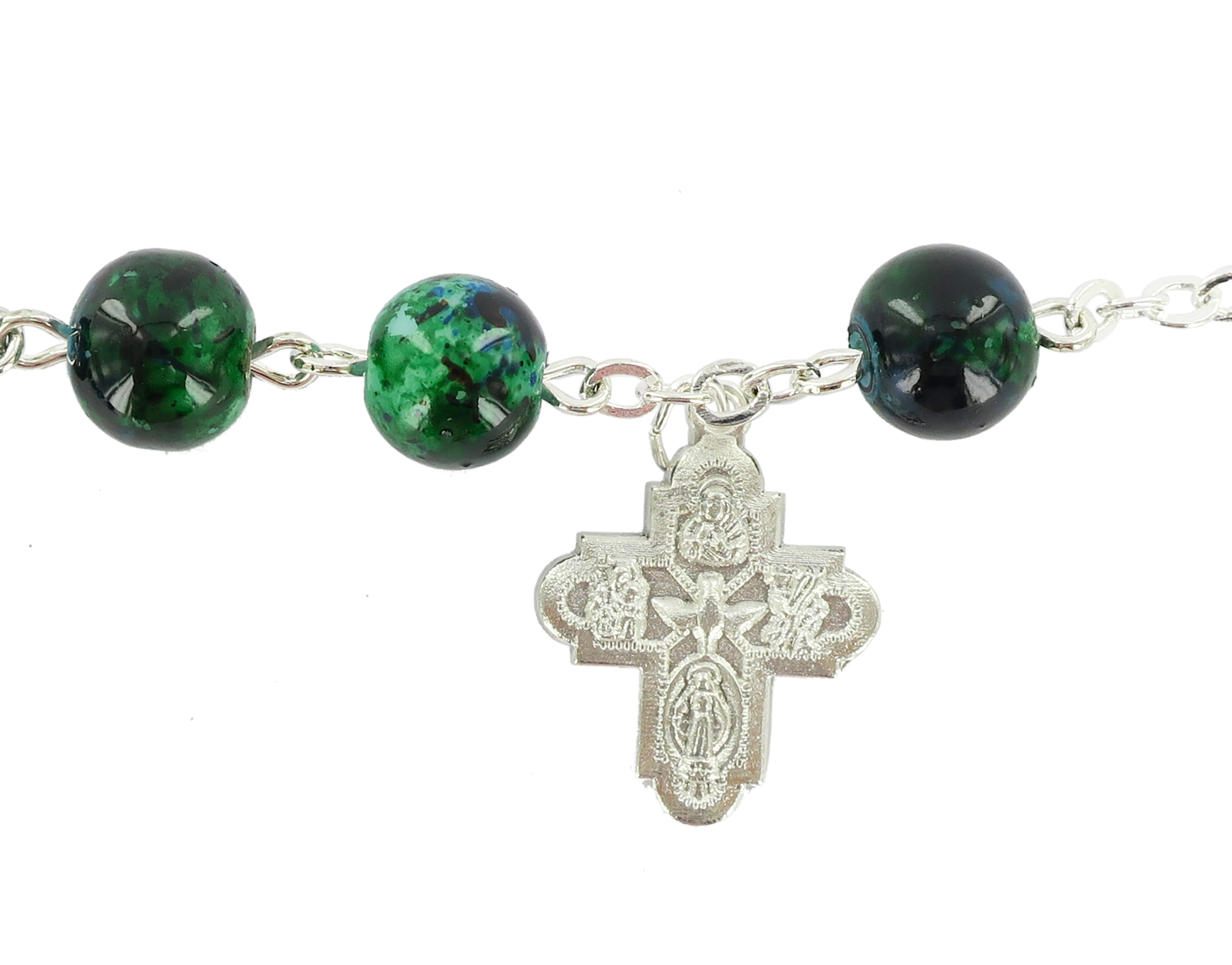 Braccialetto con palline in vetro maculato di diametro 8 mm di colore verde e croce di altezza 2 cm.