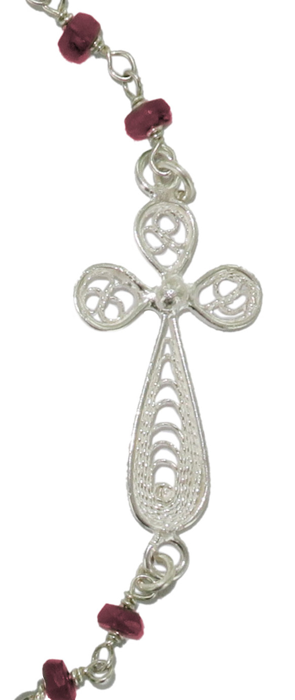 Bracciale con grani in ametista e legatura a girello con filo in argento 925% rodiato, che gli conferisce una particolare robustezza ed eleganza. L'eleganza di questo bracciale, disponibile anche con grani in giada o con zirconi neri, è data dalla croce in filigrana, anch'essa in argento 925%, finemente lavorata a mano da artigiani italiani. La misura del bracciale di 18,5 cm e può essere aumentata grazie a una catenina a maglia larga lunga circa cm 2,5. Peso del bracciale: 2,8 gr. Della stessa linea è disponibile anche la collana (articolo 0221coam)