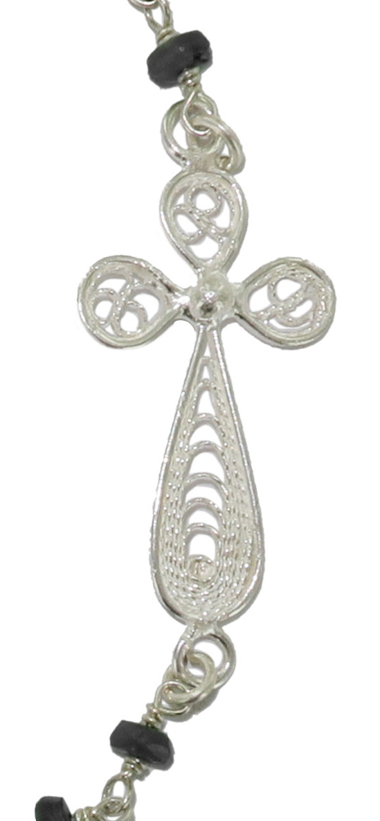 L'eleganza di questo bracciale,disponibile anche con grani in giada o in ametista,è data dalla croce in filigrana,anch'essa in argento 925%,finemente lavorata a mano da artigiani italiani.