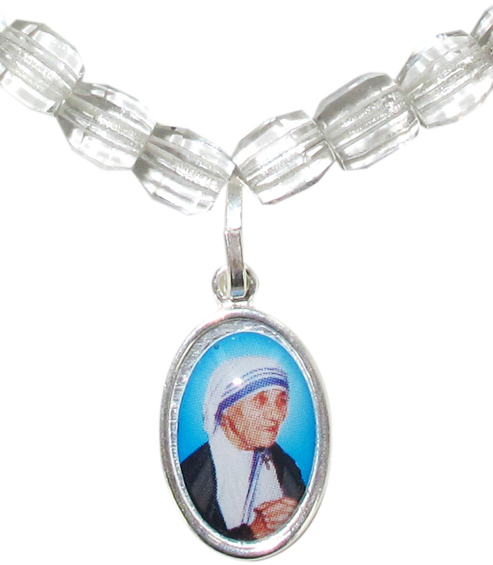 Il bracciale ha come pendente una medaglietta in argento di Santa Teresa di Calcutta,la cui immagine è resinata e si presenta in una scatoletta.