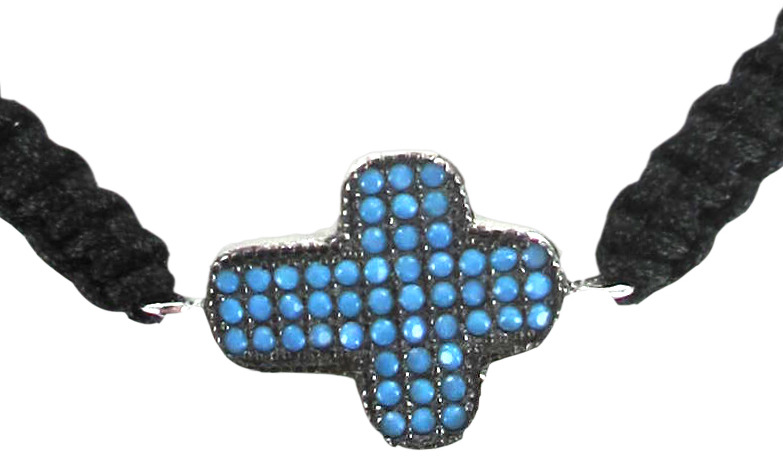 Braccialetto in corda con croce in argento bagnato in oro bianco impreziosita da strass azzurri,la cui misura è di cm 1,3x1.