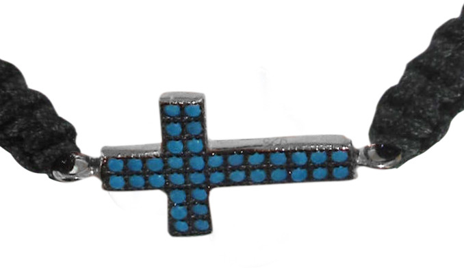 Braccialetto in corda con croce in argento bagno oro bianco impreziosita da strass azzurri,la cui misura è di cm 1,4x1.