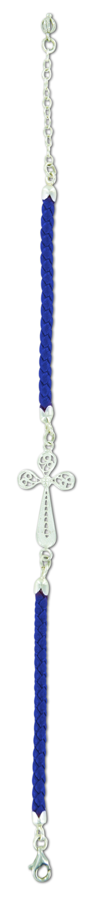Questo bracciale è in ecopelle intrecciata di colore blu con una croce in filigrana d'argento 925.