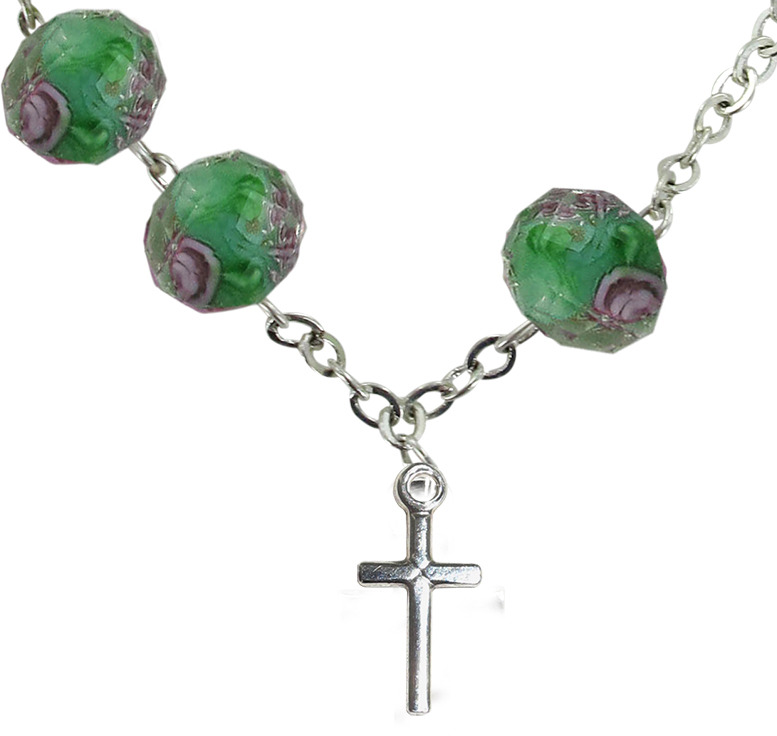 Braccialetto con grani in vetro pressato sfaccettato di colore ametista con fiori rilegato in argento.