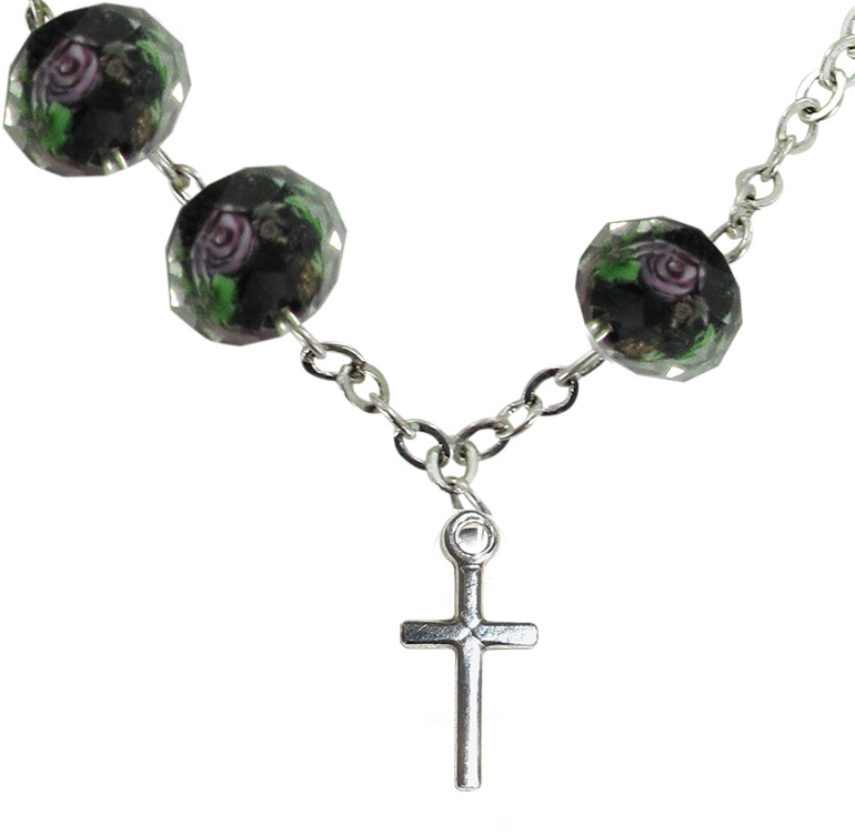 Braccialetto con grani in vetro pressato sfaccettato di colore nero con fiori rilegato in argento.