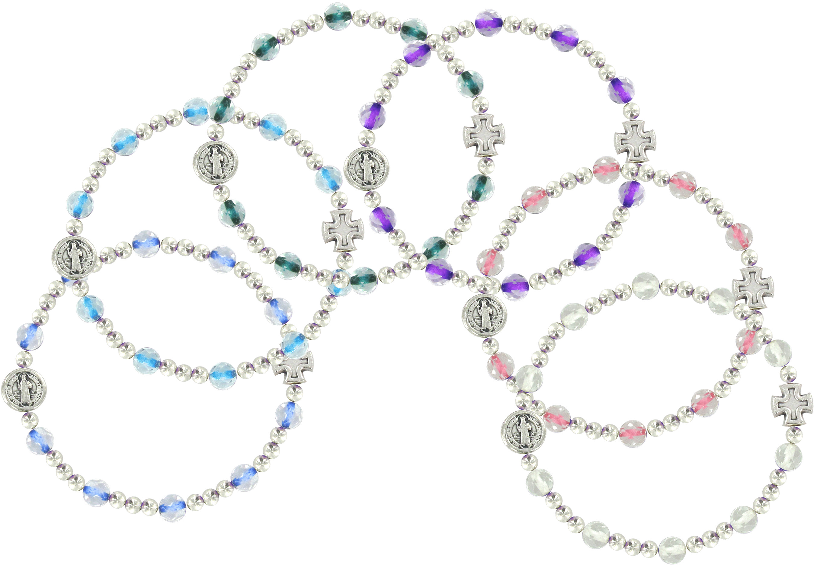 Braccialetto con sfere sfacettate in semicristallo e acciaio con medaglia e croce di San Benedetto dotata di