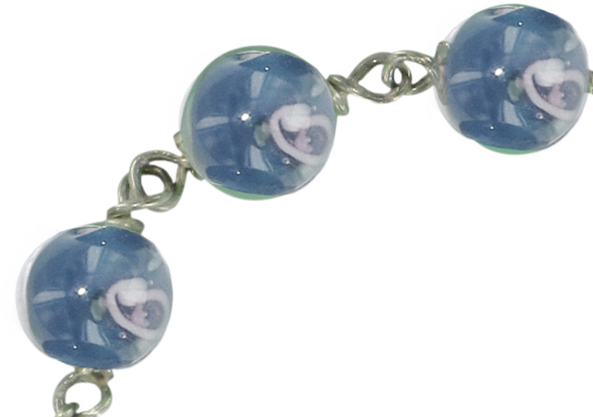 Braccialetto con 11 grani a forma di roselline in vetro azzurro e argento.