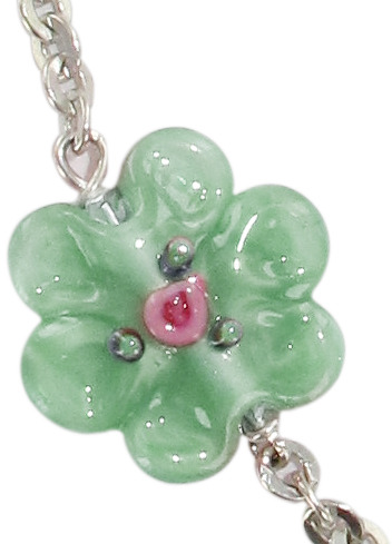 Braccialetto con grani a forma di roselline in vetro verde e argento.