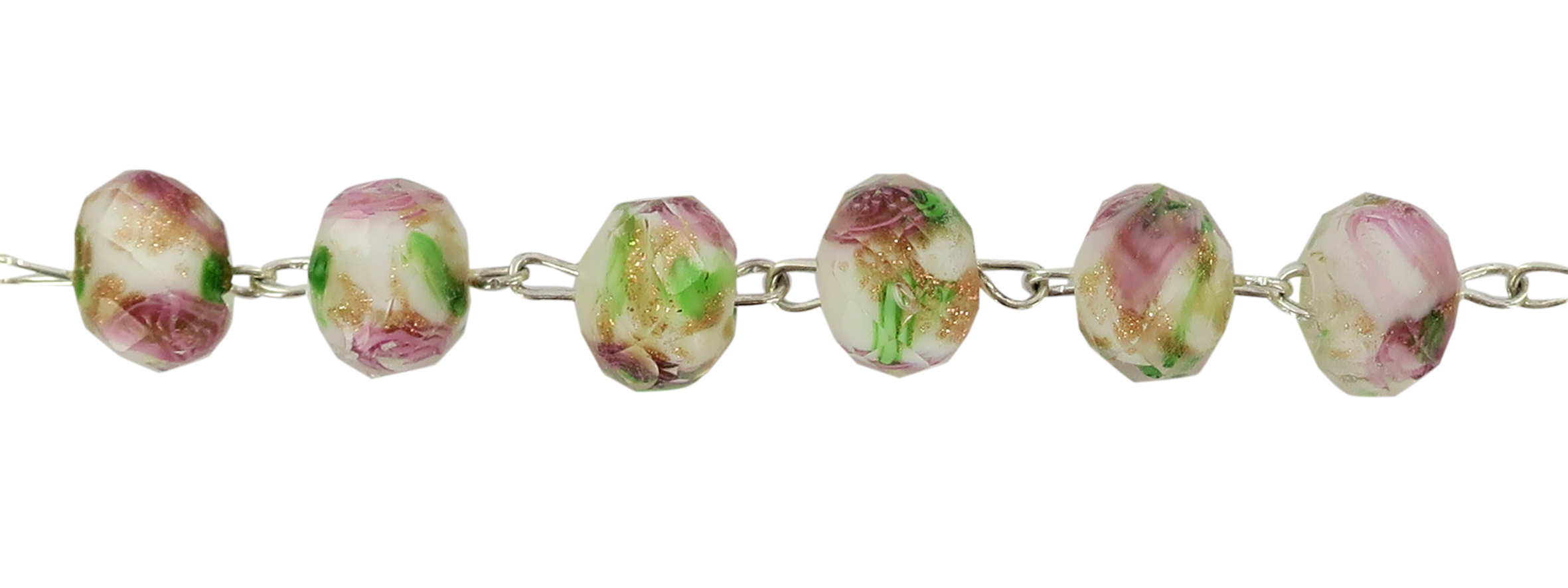 Braccialetto con grani di diametro 7 mm in vetro sfaccettato di colore bianco con fiori di colore