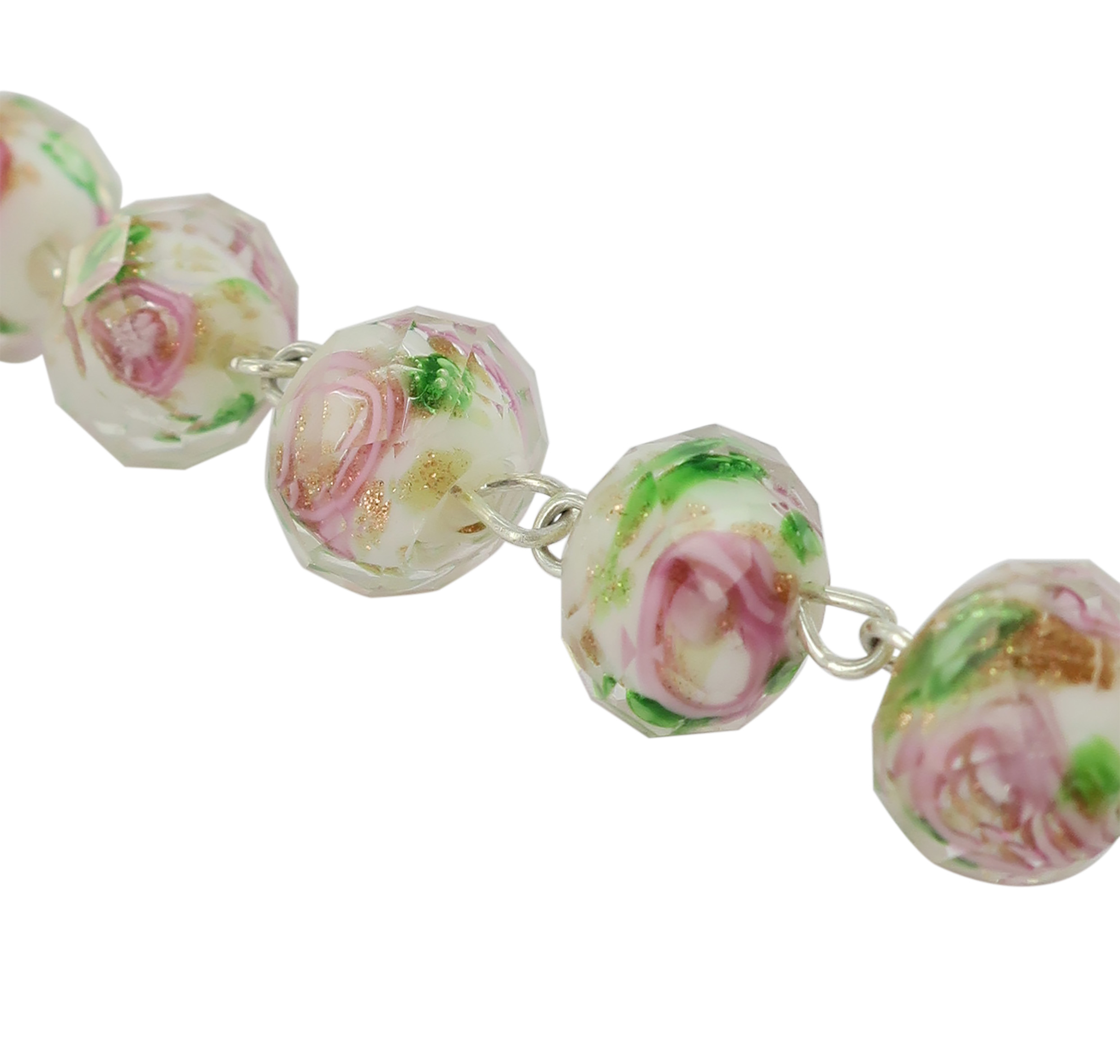 Braccialetto con grani di diametro 7 mm in vetro sfaccettato di colore bianco con fiori di colore rosa