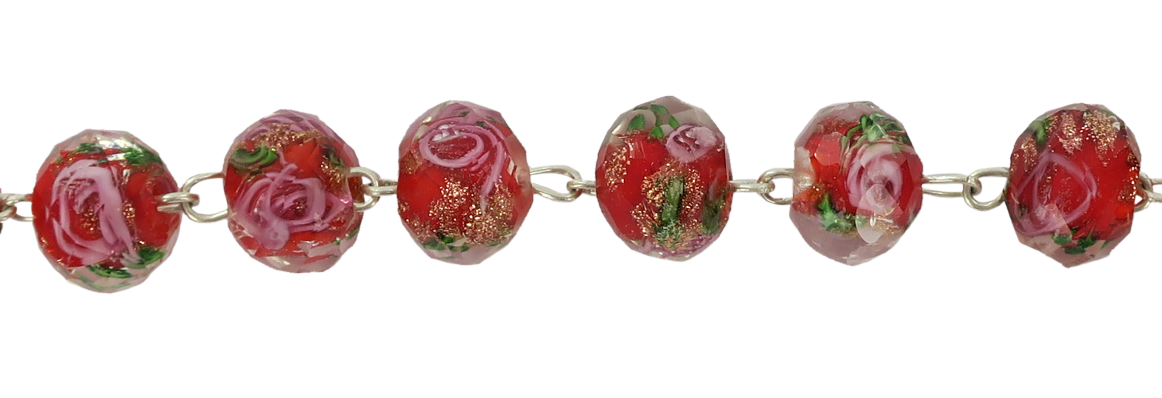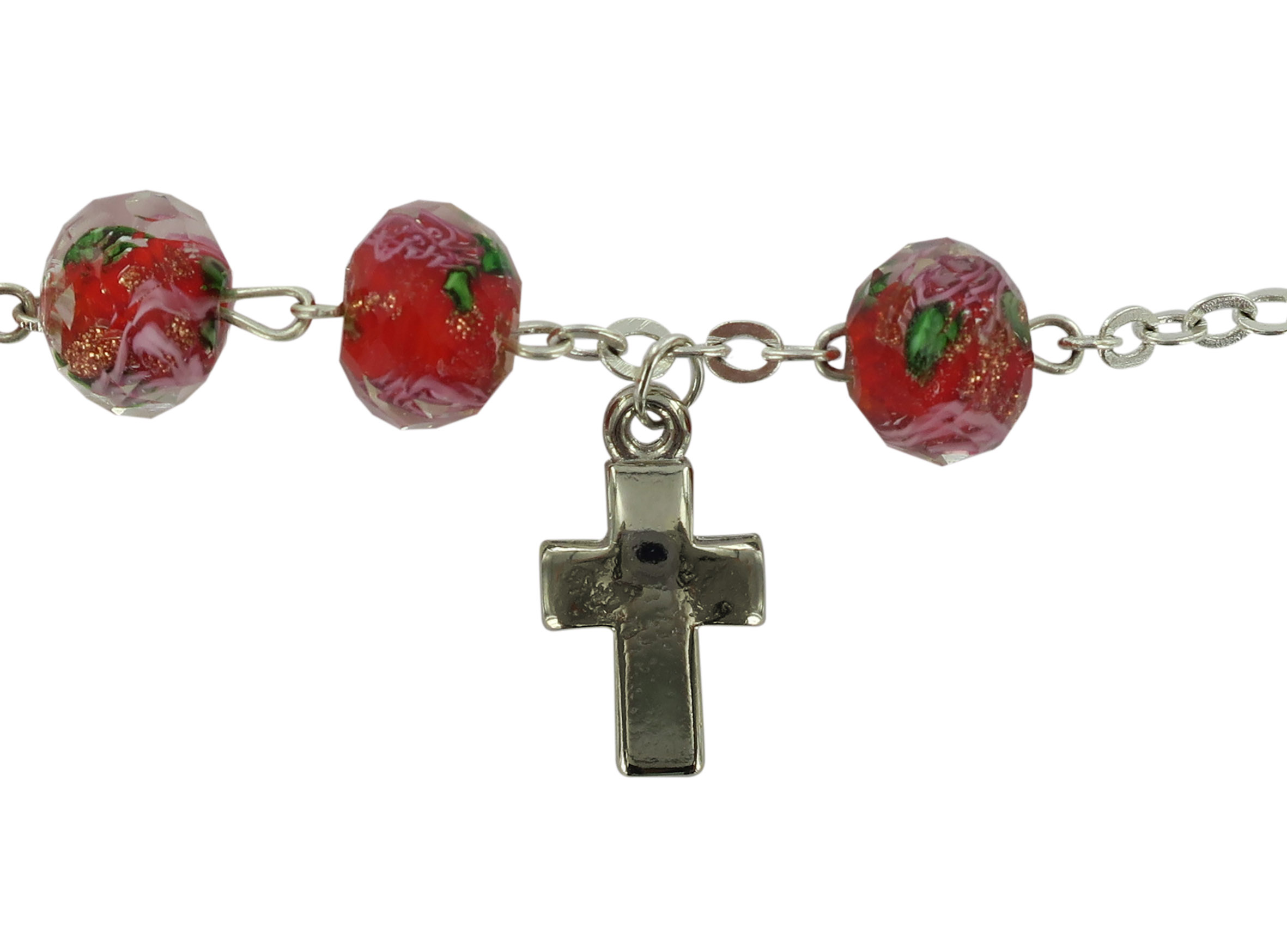 Braccialetto rosario con grani di diametro 7 mm in vetro sfaccettato di colore rosso con fiori di colore