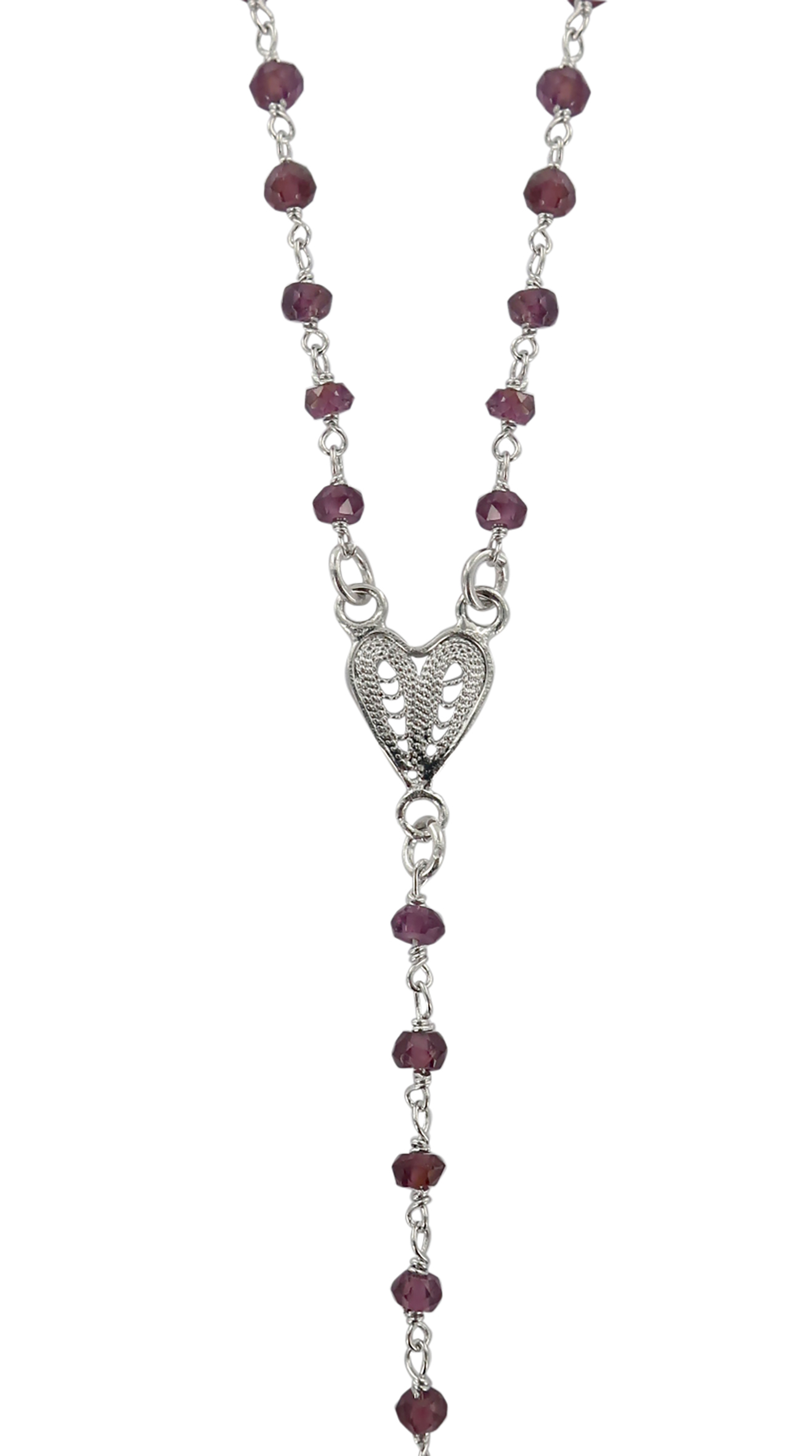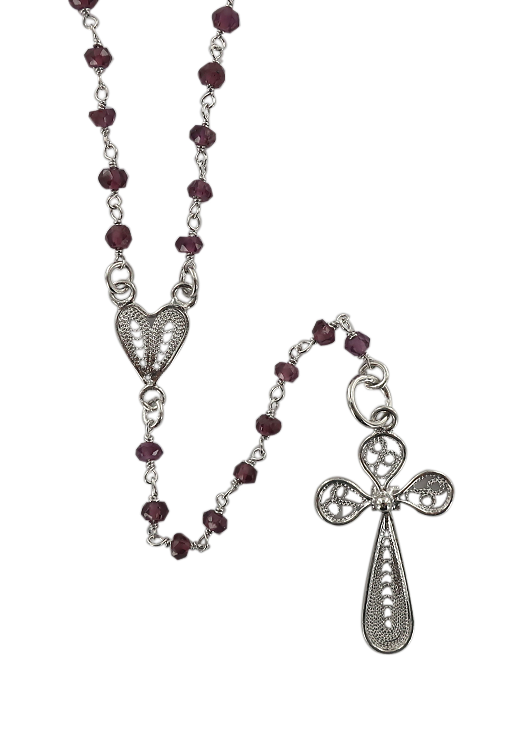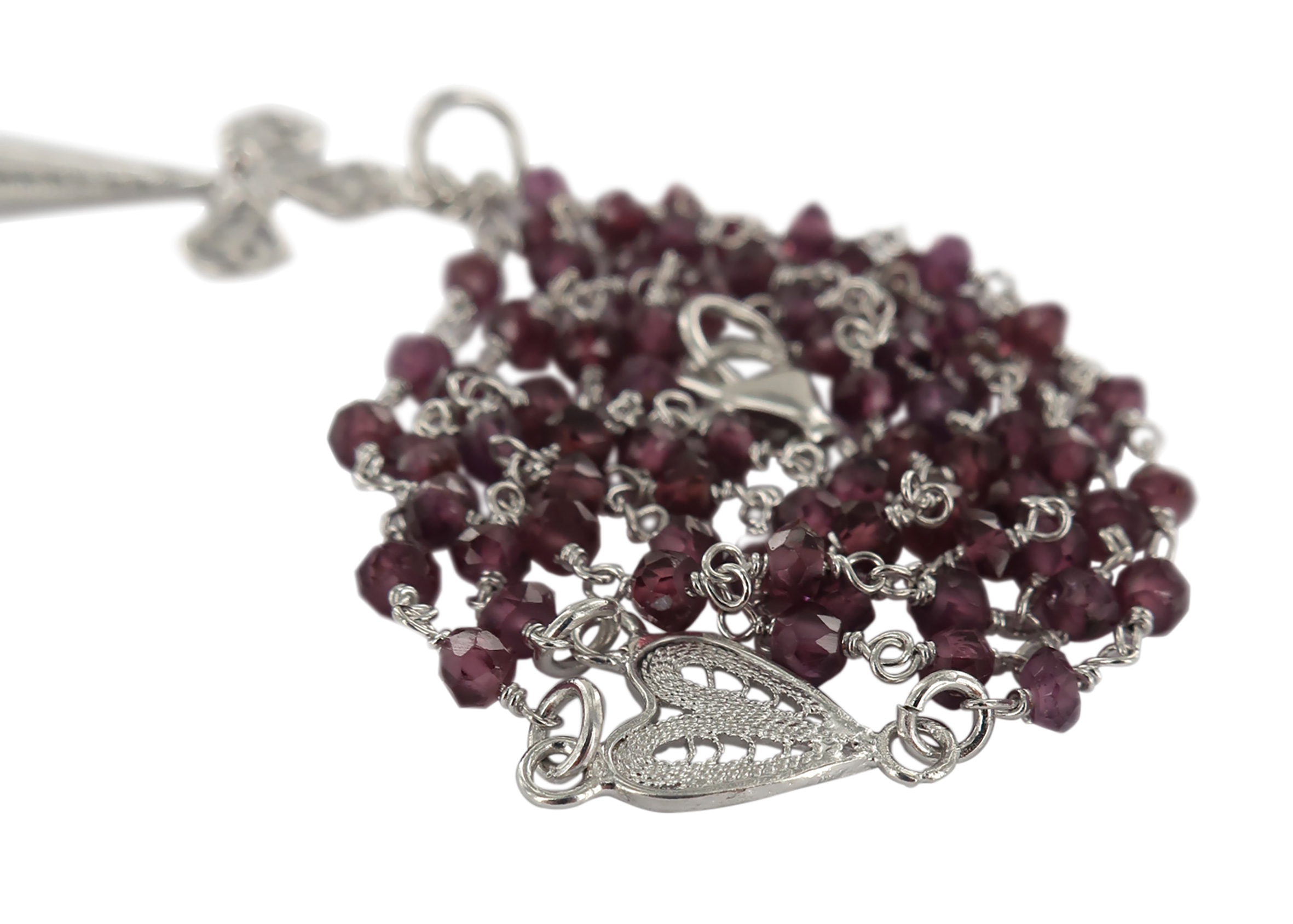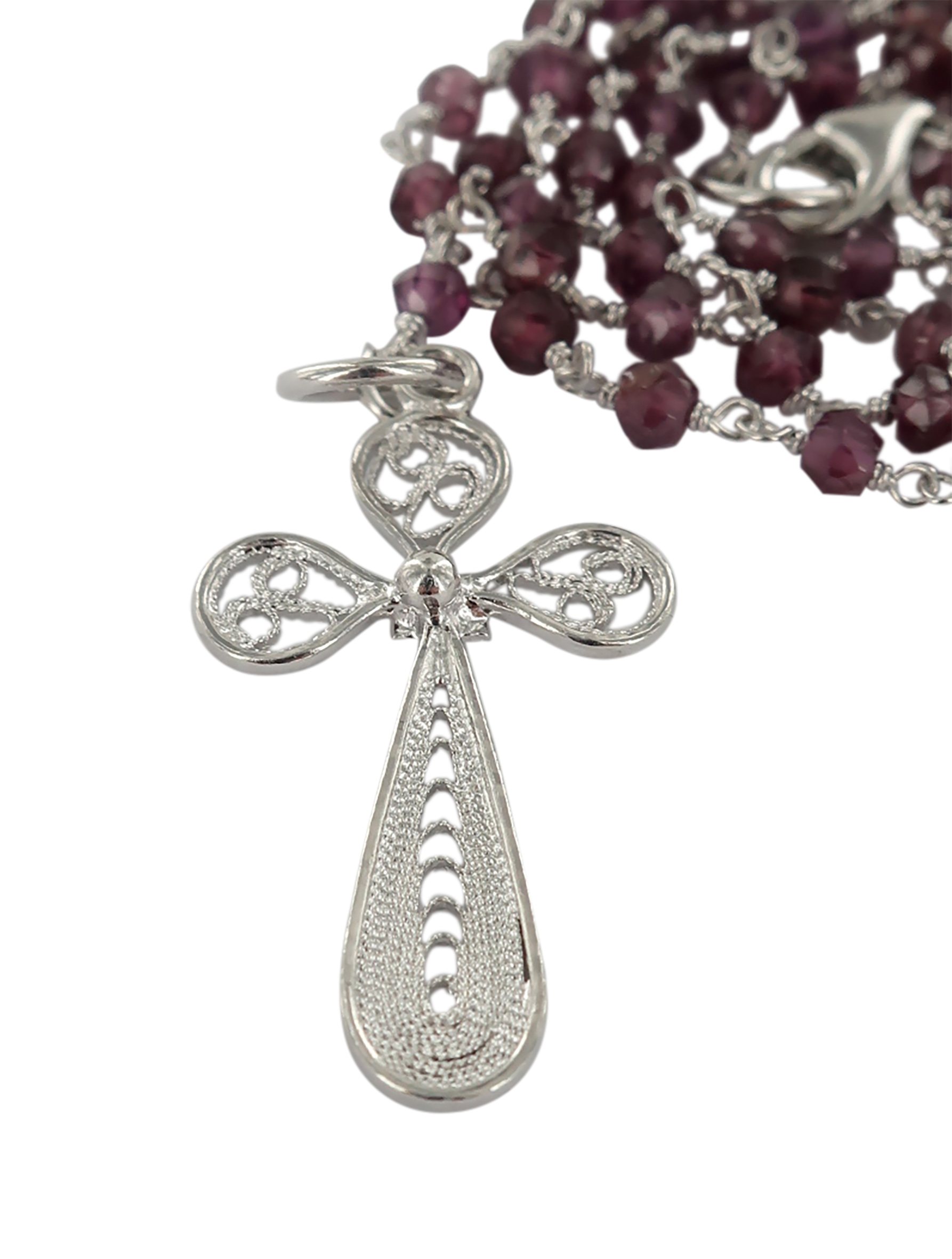 La particolarità di questo articolo,che è disponibile anche con grani in giada o con zirconi neri,è dato dalla croce e dalla crocera in filigrana finemente lavorata a mano da artigiani italiani.