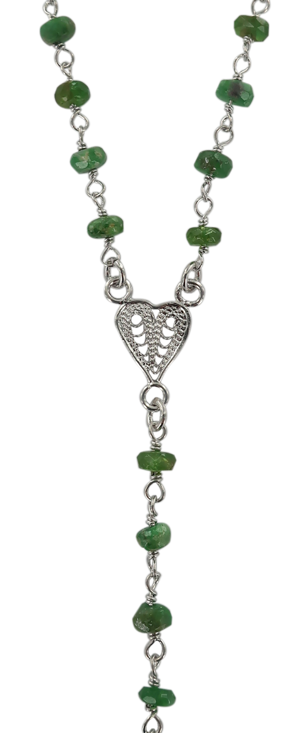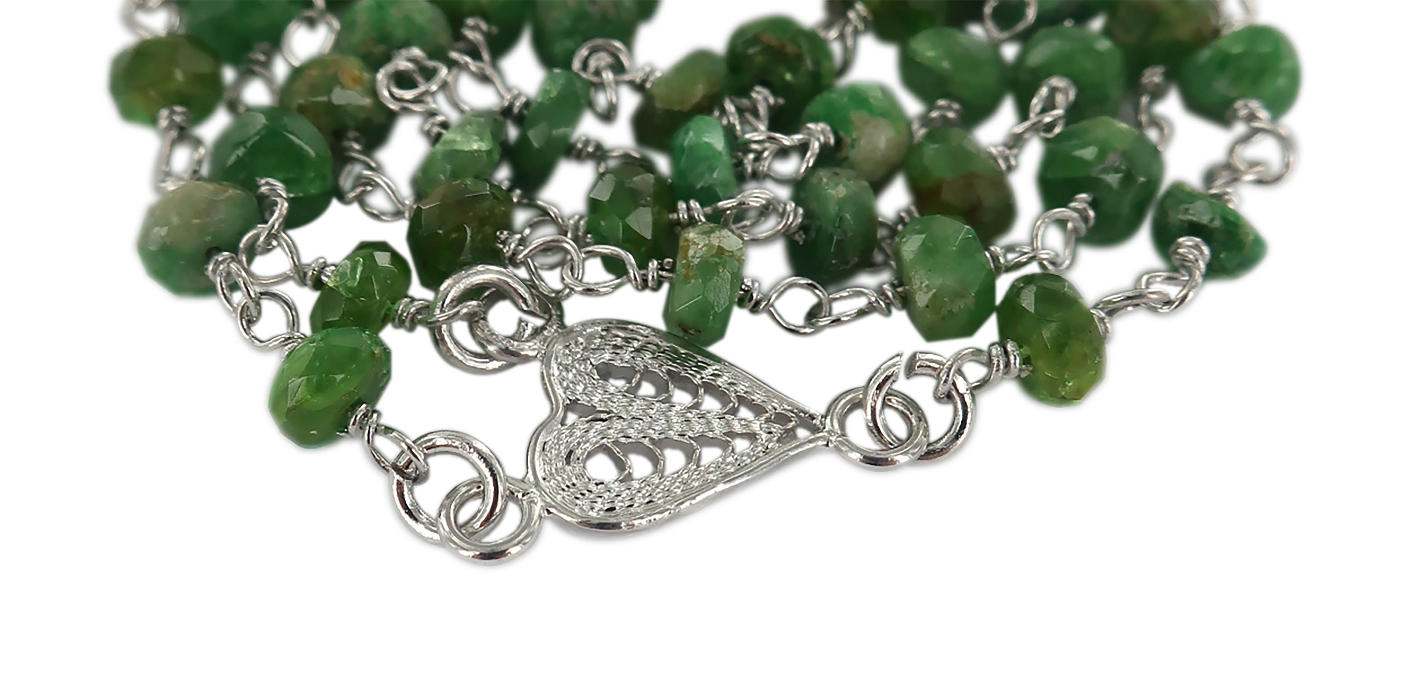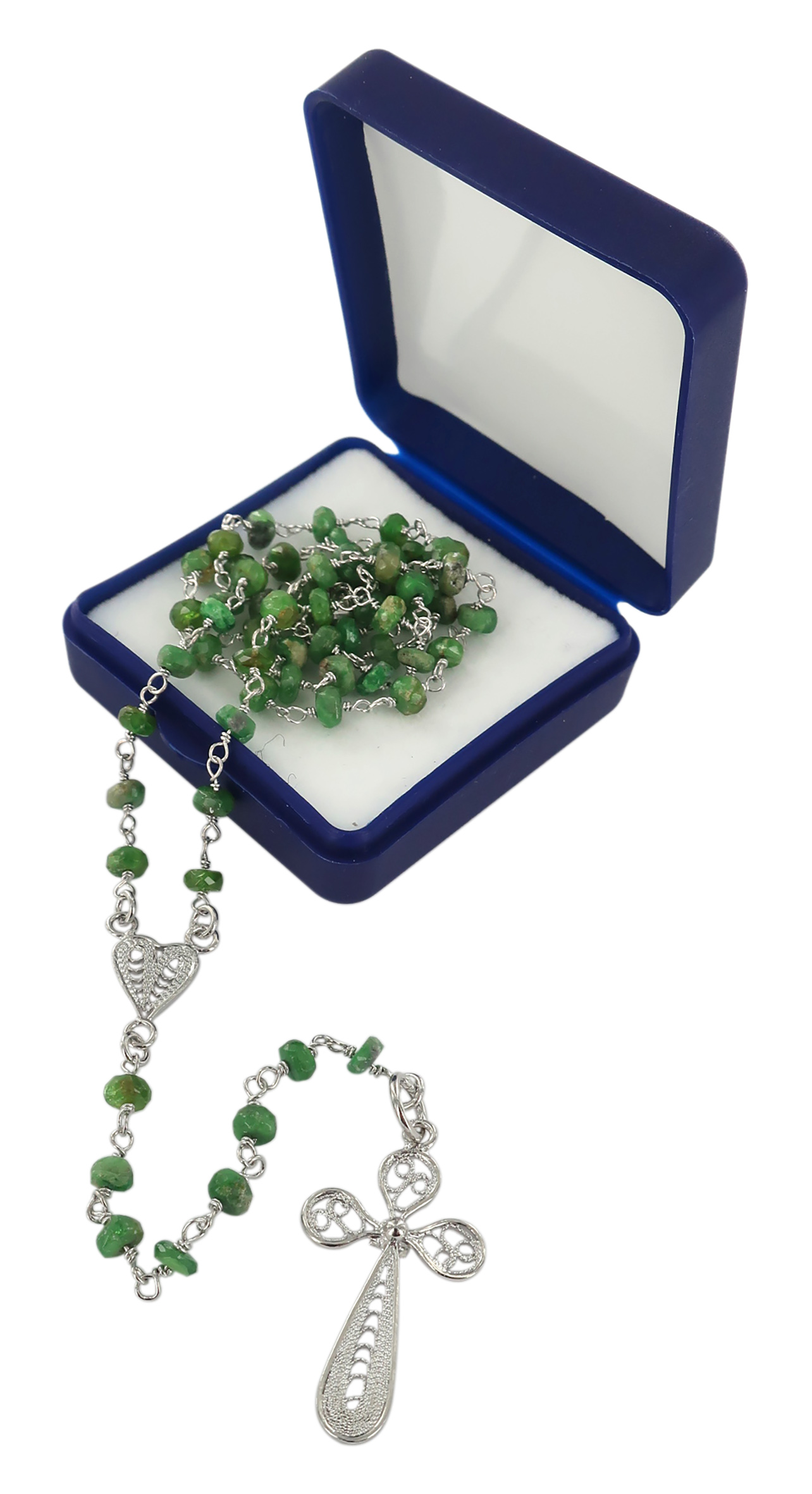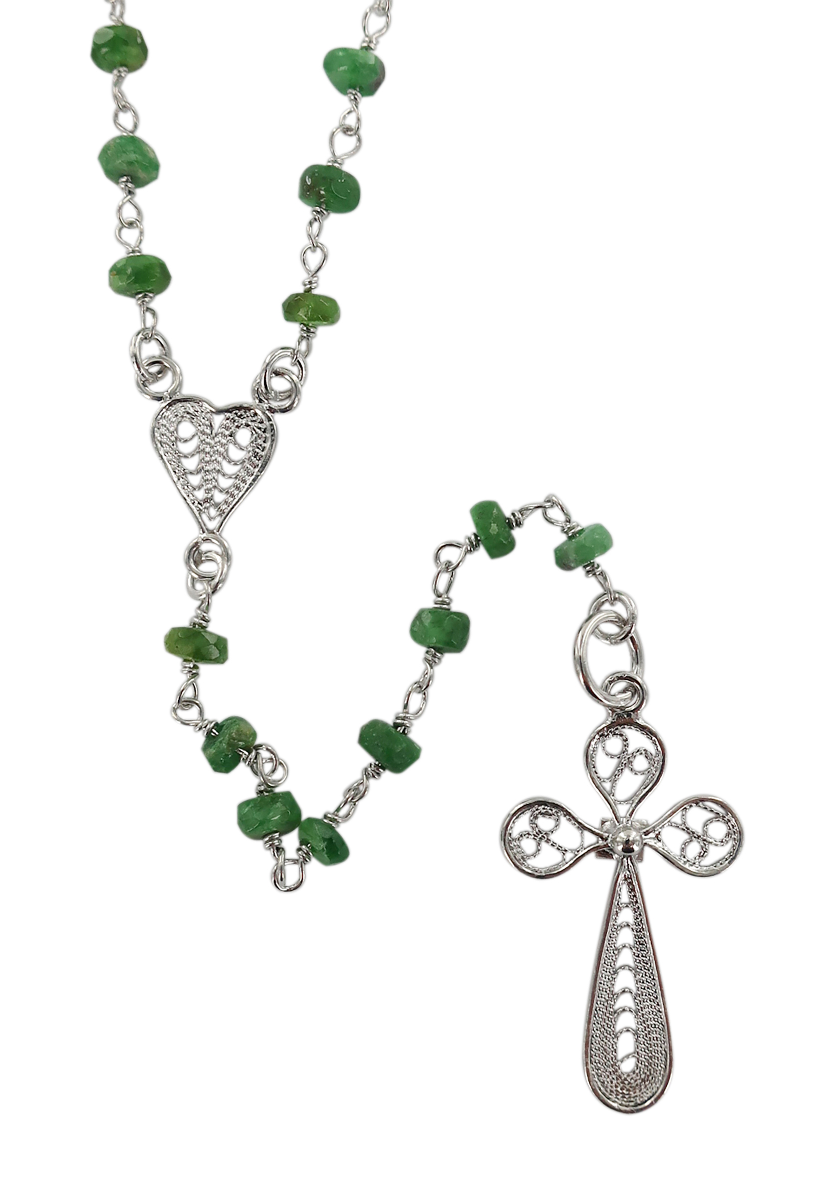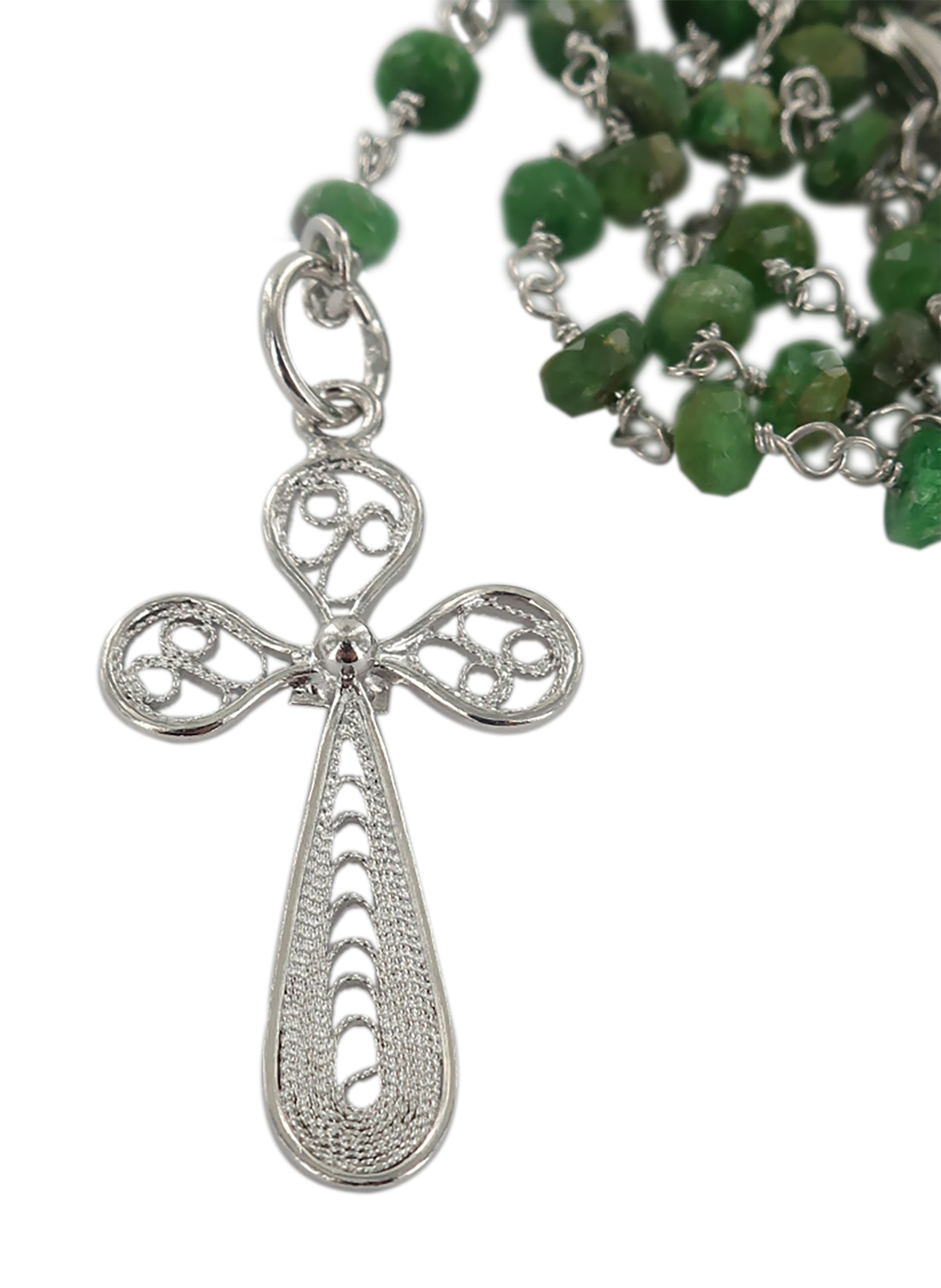 La particolarità di questo articolo,che è disponibile anche con grani in ametista o con zirconi neri,è dato dalla croce e dalla crocera in filigrana finemente lavorata a mano da artigiani italiani.