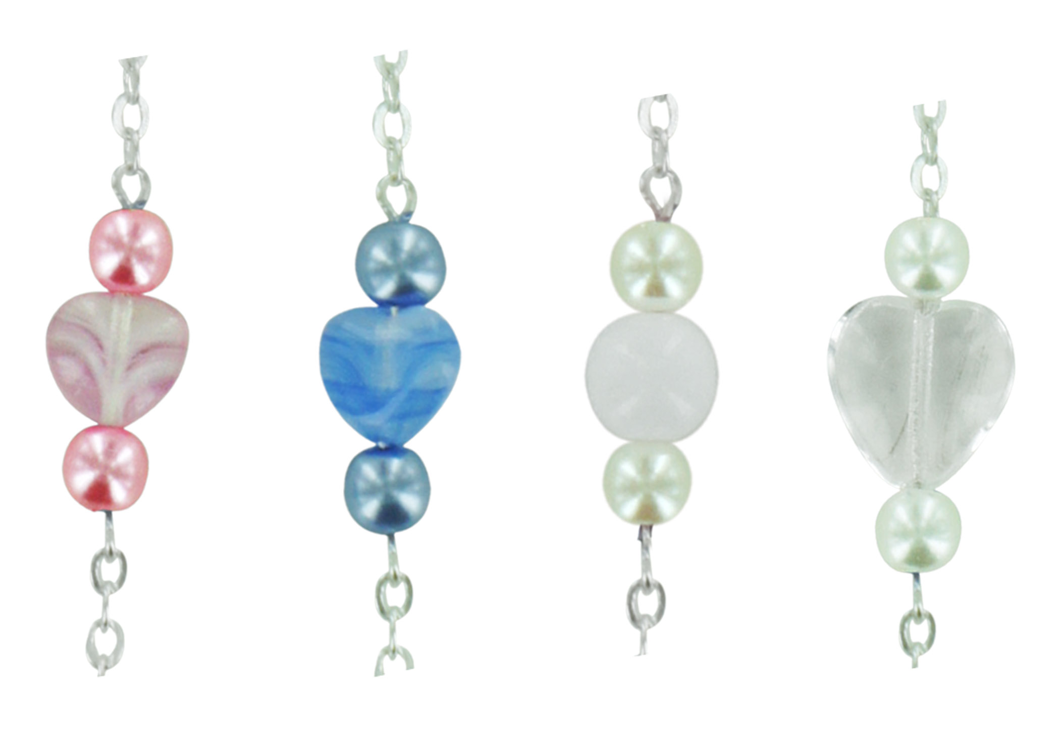 Ogni collana decina è inscatolata, si presentano lunghe cm 60 con una piccola croce bombata in metallo lucido, i grani in vetro sono a forma di cuore o tondi nei colori rosa, azzurro e bianco e legati con catena argentata.