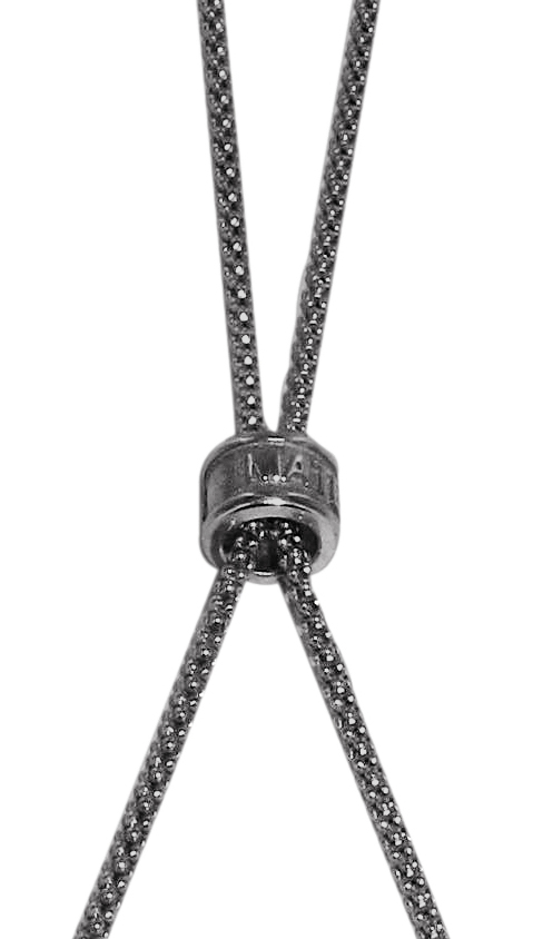 Collana sali e scendi in argento brunito, con circonferenza di circa 58 cm (lunghezza lineare, con le due piccole croci: 30 cm). Il sistema sali e scendi consente di regolare l'altezza dei due graziosi ciondoli a forma di croce Tau, dalla superficie liscia, sul petto - e adattare la vestibilità della collana al proprio collo. Non dispone di moschettone, quindi la collana può essere indossata solo infilandola dall'alto. La maglia della catenina risulta molto fitta e resistente. L'anellino che scorre e che blocca i due fili della catenina riporta la scritta "MATER".