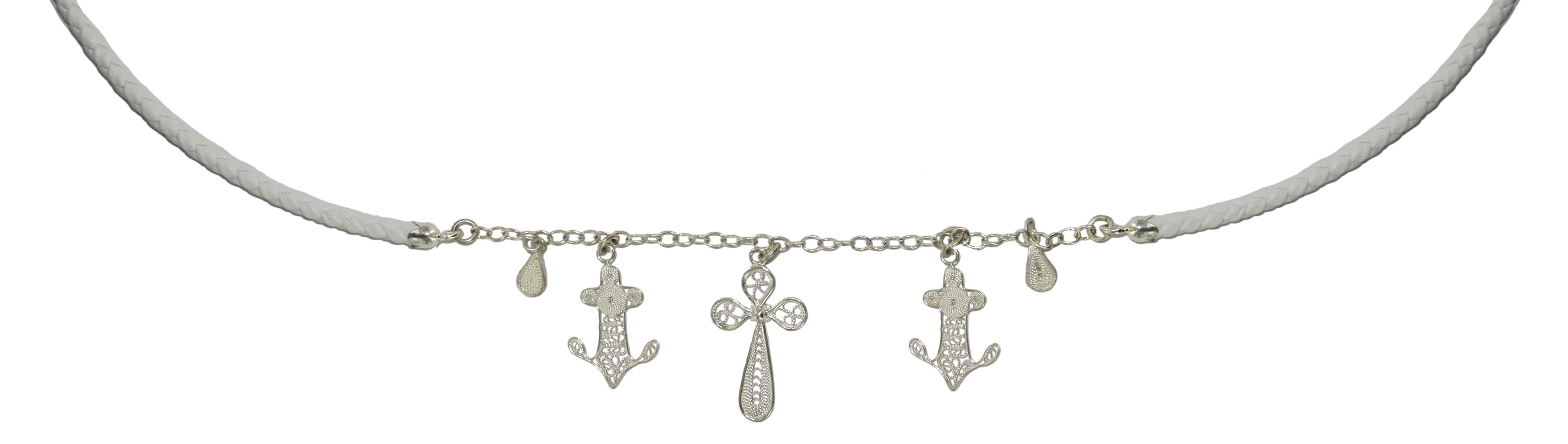Girocollo realizzato in ecopelle intrecciata di colore bianco e parti in argento 925%,quali la chiusura,i ciondoli e la croce.