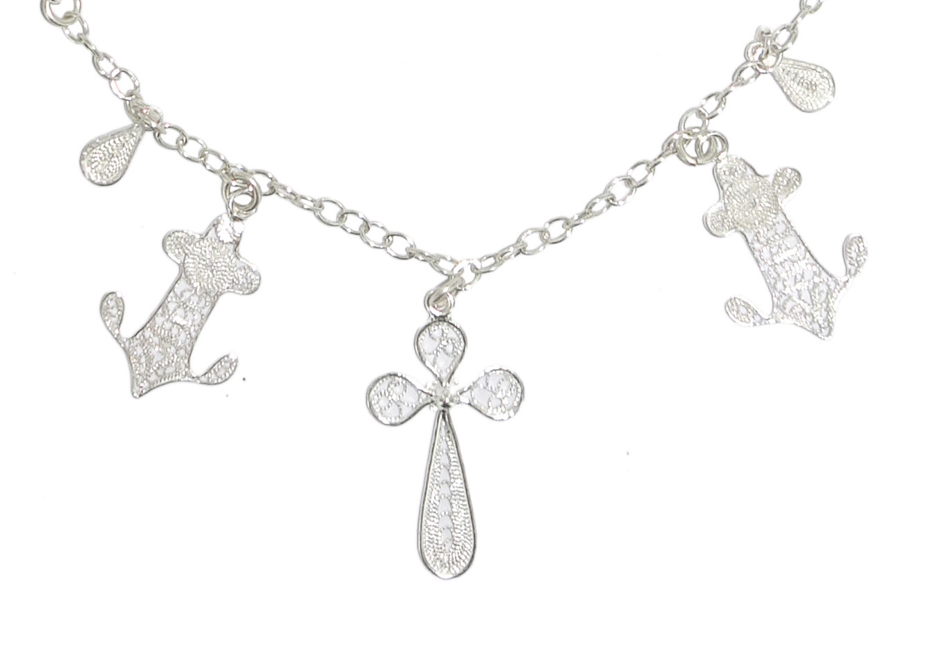 La croce cosi' come i ciondoli e le ancore sono in filigrana ovvero realizzati con fili d'argento che si intrecciano all'interno della struttura sia della croce che dei pendenti,creando un elegante effetto traforato.