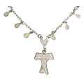 La croce tau cosi' come i ciondoli sono in filigrana ovvero realizzati con fili d'argento che si intrecciano all'interno della struttura sia della croce che dei pendenti,creando un elegante effetto traforato.