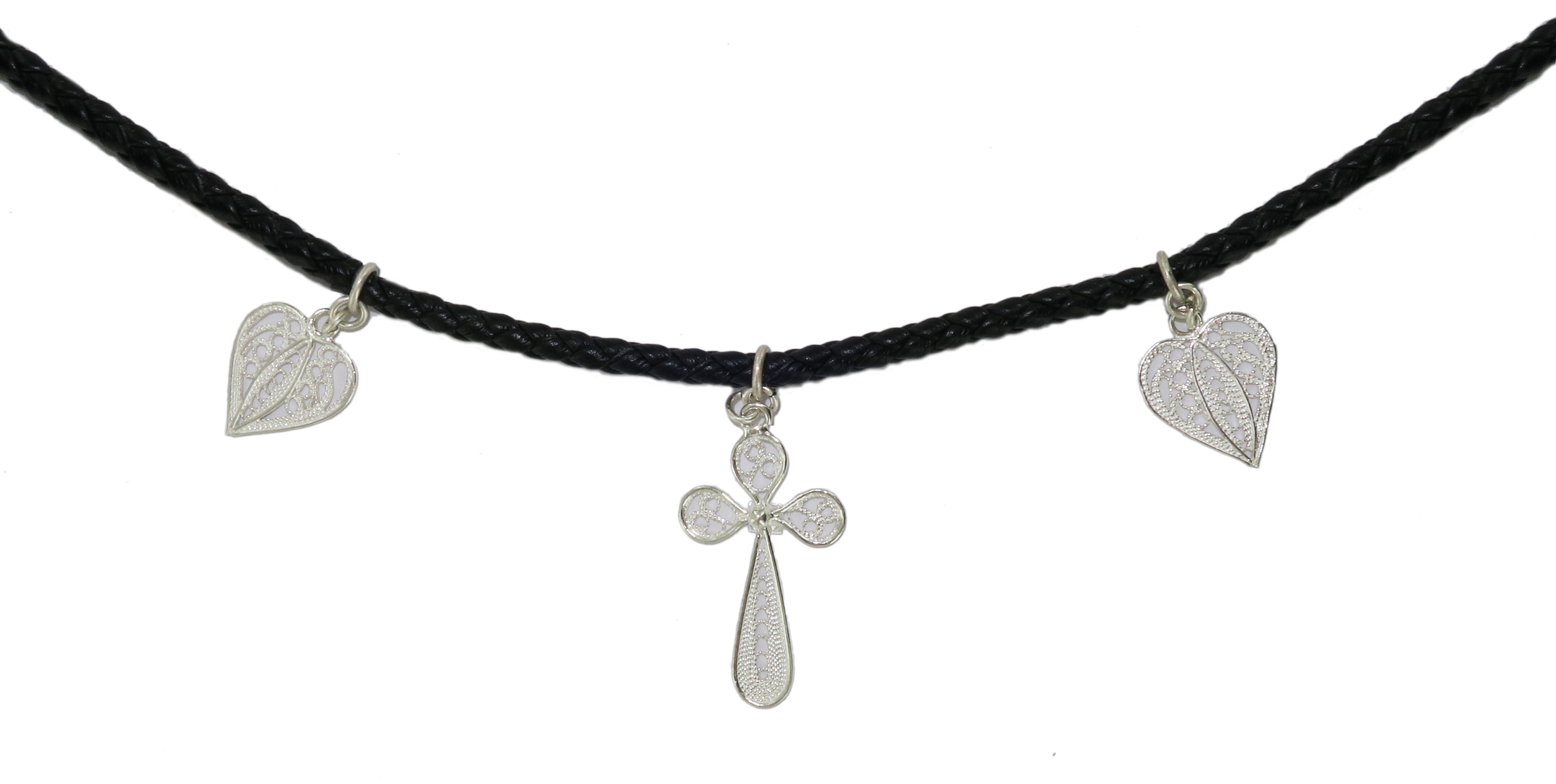 Girocollo in ecopelle nera con croce e cuori filigrana in argento