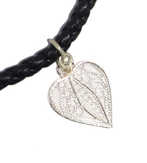 La croce cosi' come i ciondoli a forma di cuore sono in filigrana ovvero realizzati con fili d'argento che si intrecciano all'interno della struttura sia della croce che dei pendenti,creando un elegante effetto traforato.