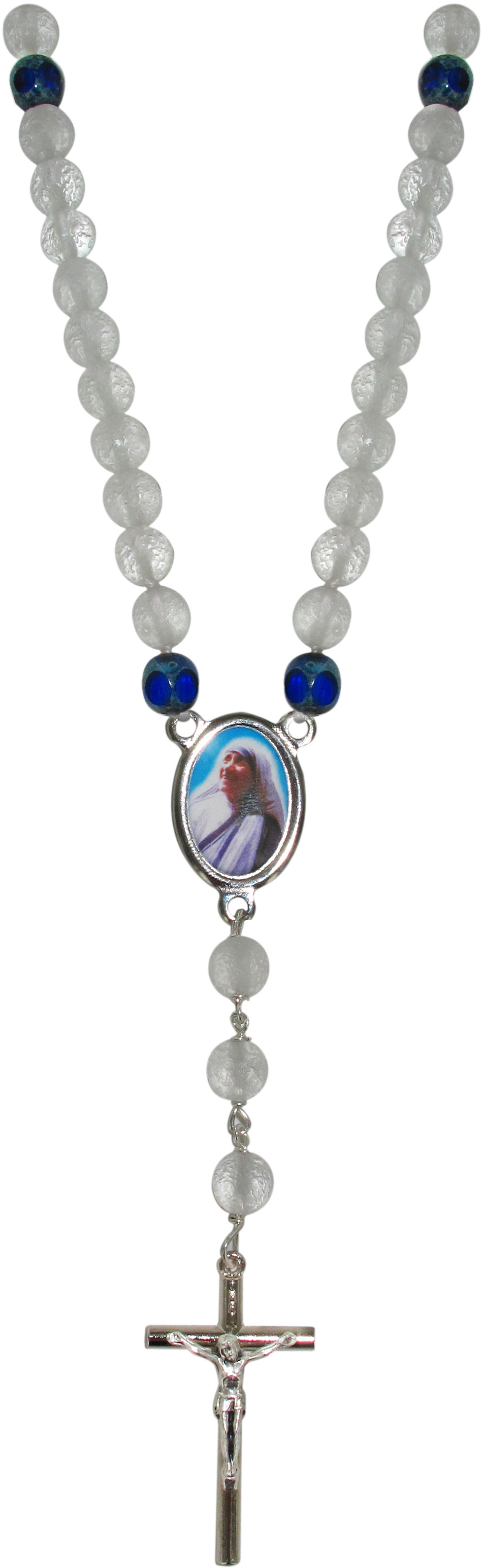 Rosario collana con grani in vetro bianco satinato da mm 7 e pater in vetro sfaccettato di colore blu marmorizzato.