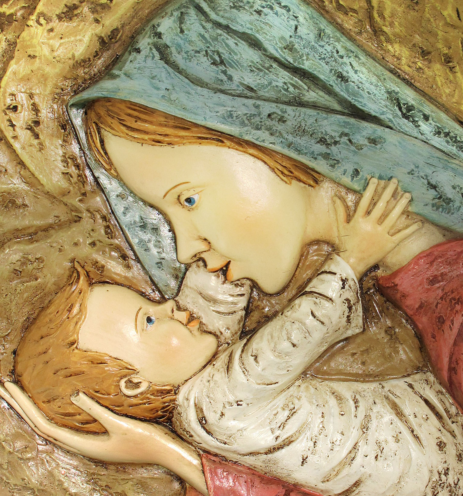 Bassorilievo di forma quadrata raffigurante la Madonna con il Bambino in resina colorata di misura 18 x 18 cm. La Madonna abbraccia affettuosamente il Bambino rappresentando l'amore puro e il legame imprescindibile fra i due. Il Bassorilievo può essere appeso grazie al gancio in metallo apposto sul retro. Il prodotto è realizzato prestando la massima attenzione e cura ai dettagli e verrà consegnato in una confezione in cartone. Ideale come regalo di nascita.