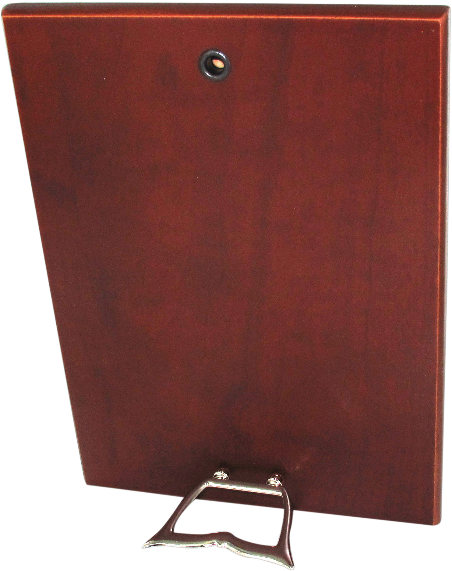 Il retro in legno scuro presenta un appoggio e un piccolo foro per essere appeso al muro.