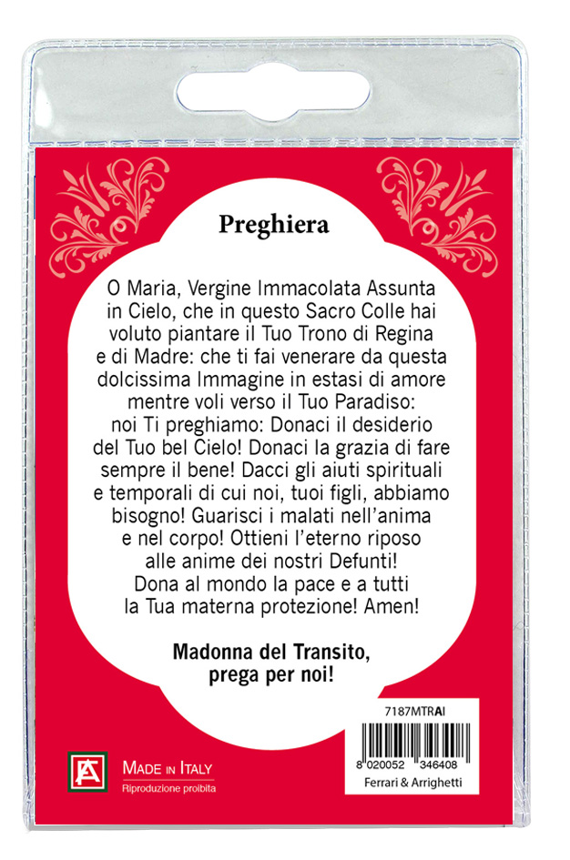 Il blister si presenta con all'interno un cartoncino che rappresenta il particolare di un affresco del Santuario dedicato alla Madonna del Transito.
