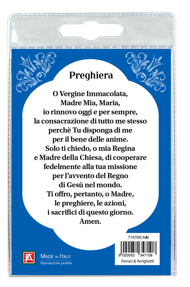 Il blister si presenta con all'interno un cartoncino rappresentante l'immagine della Madonna di Caorle, sul retro è stampata una preghiera in italiano dedicata alla Vergine Maria.